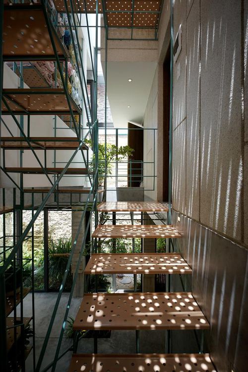 Cách sử dụng cấu trúc rỗng cho hệ thang cũng giúp khu giếng trời nhỏ có cảm giác thông thoáng hơn và lấy được ánh sáng dịu nhẹ xuống những không gian bên dưới.