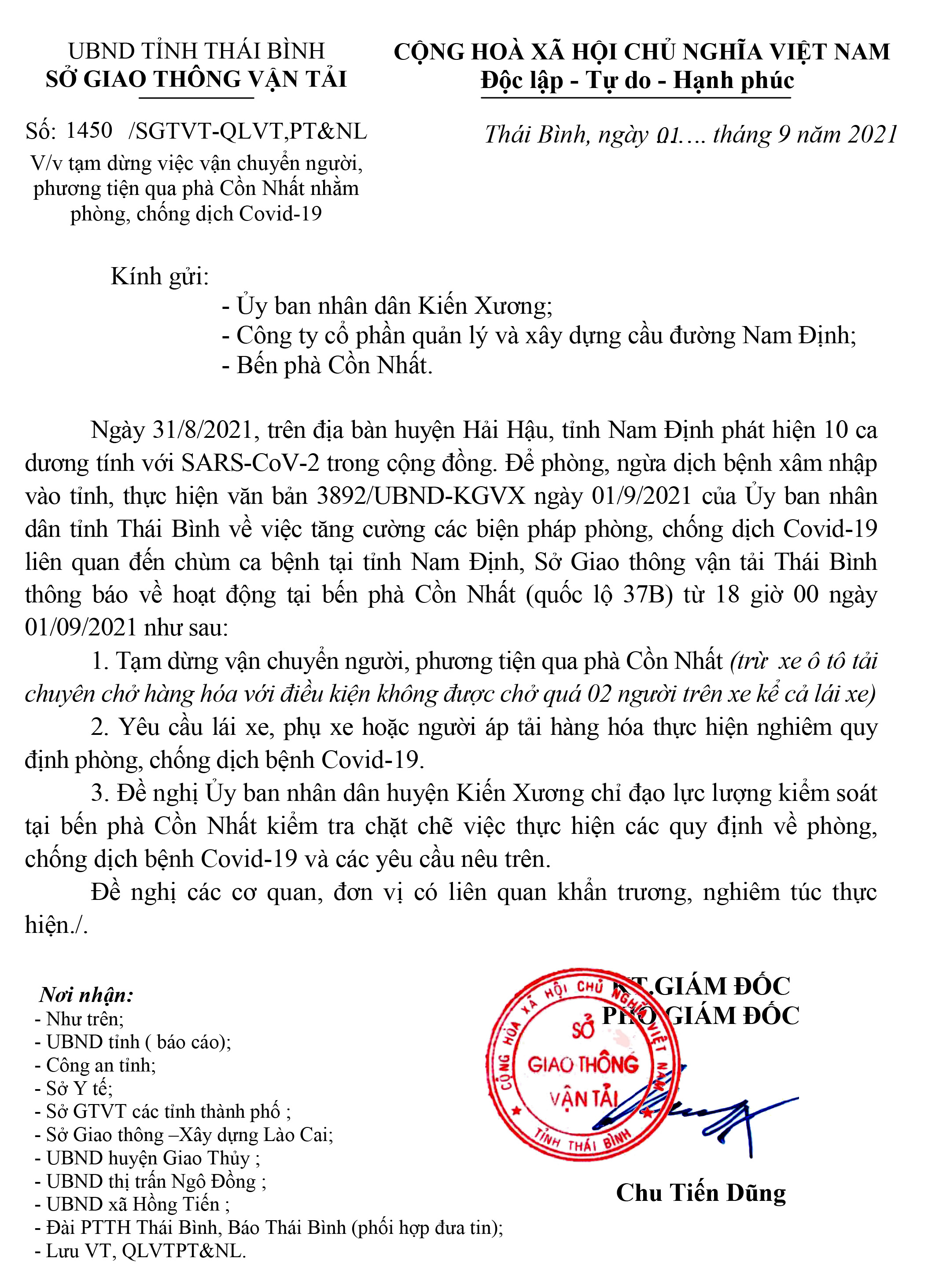 Công văn số 1450/SGTVT-QLVT,PL&NL ngày 01/9/2021 của Sở Giao thông Vận tải tỉnh Thái Bình về việc tạm dừng việc vận chuyển người, phương tiện qua phà Cồn Nhất nhằm phòng, chống dịch Covid-19.