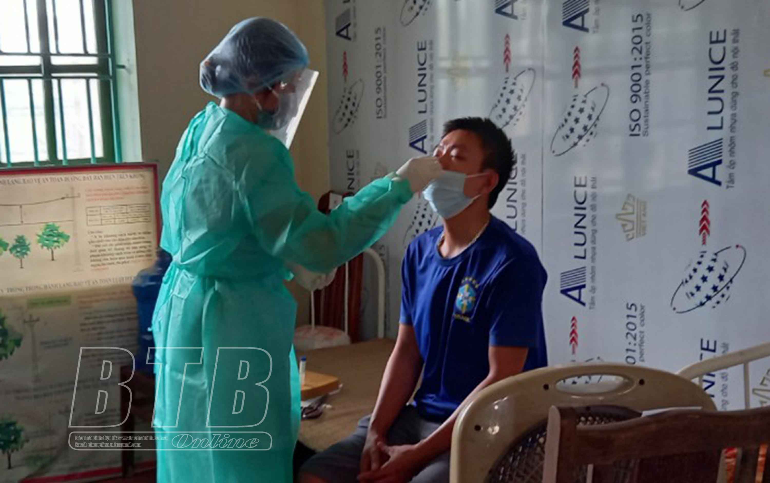 Cán bộ Trung tâm Y tế huyện Kiến Xương lấy mẫu xét nghiệm người từ huyện Hải Hậu về địa bàn huyện.