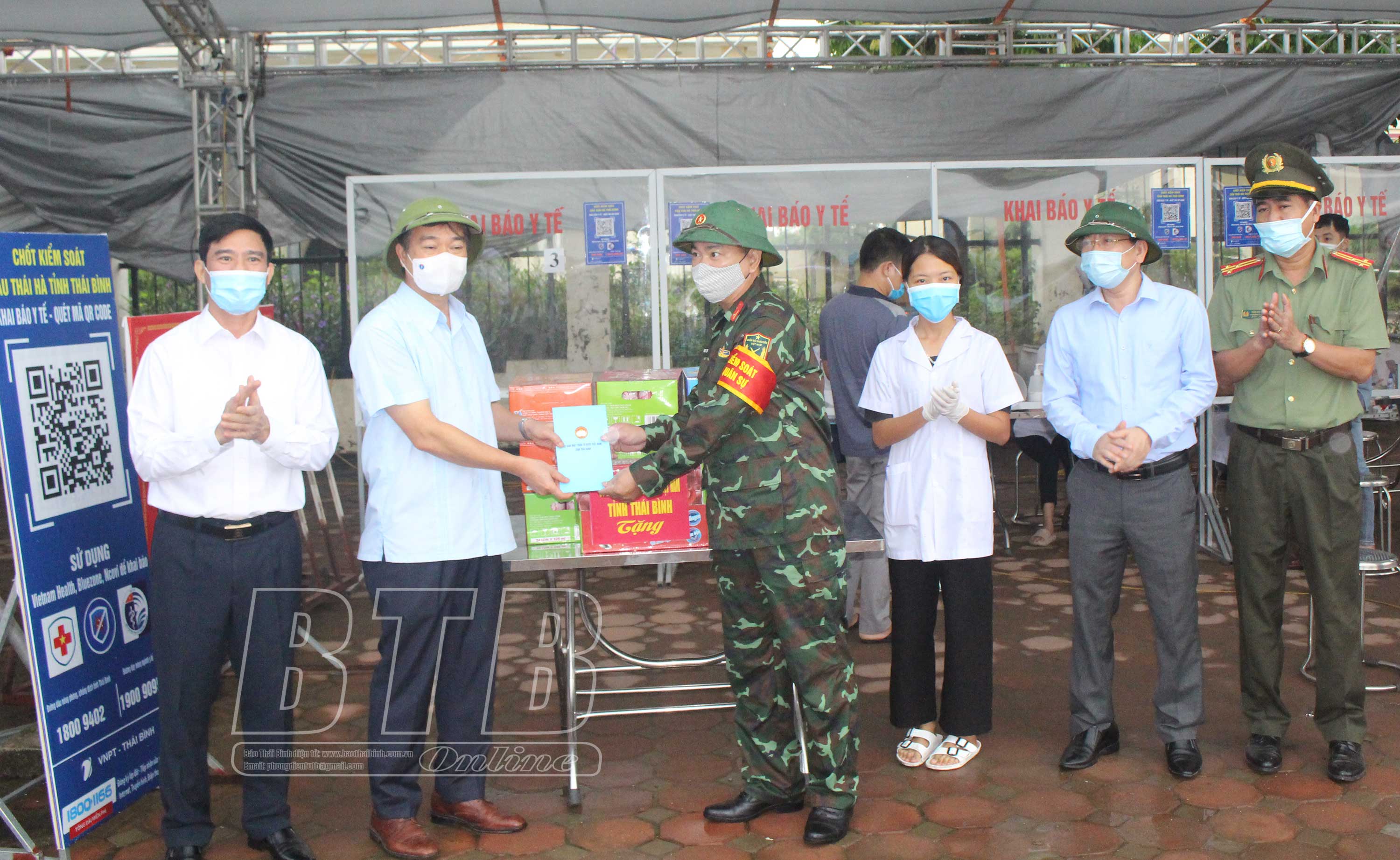 Đồng chí Nguyễn Văn Giang, Ủy viên Ban Thường vụ, Trưởng ban Dân vận Tỉnh ủy, Chủ tịch Ủy ban MTTQ tỉnh thăm, tặng quà chốt kiểm soát dịch cầu Thái Hà.