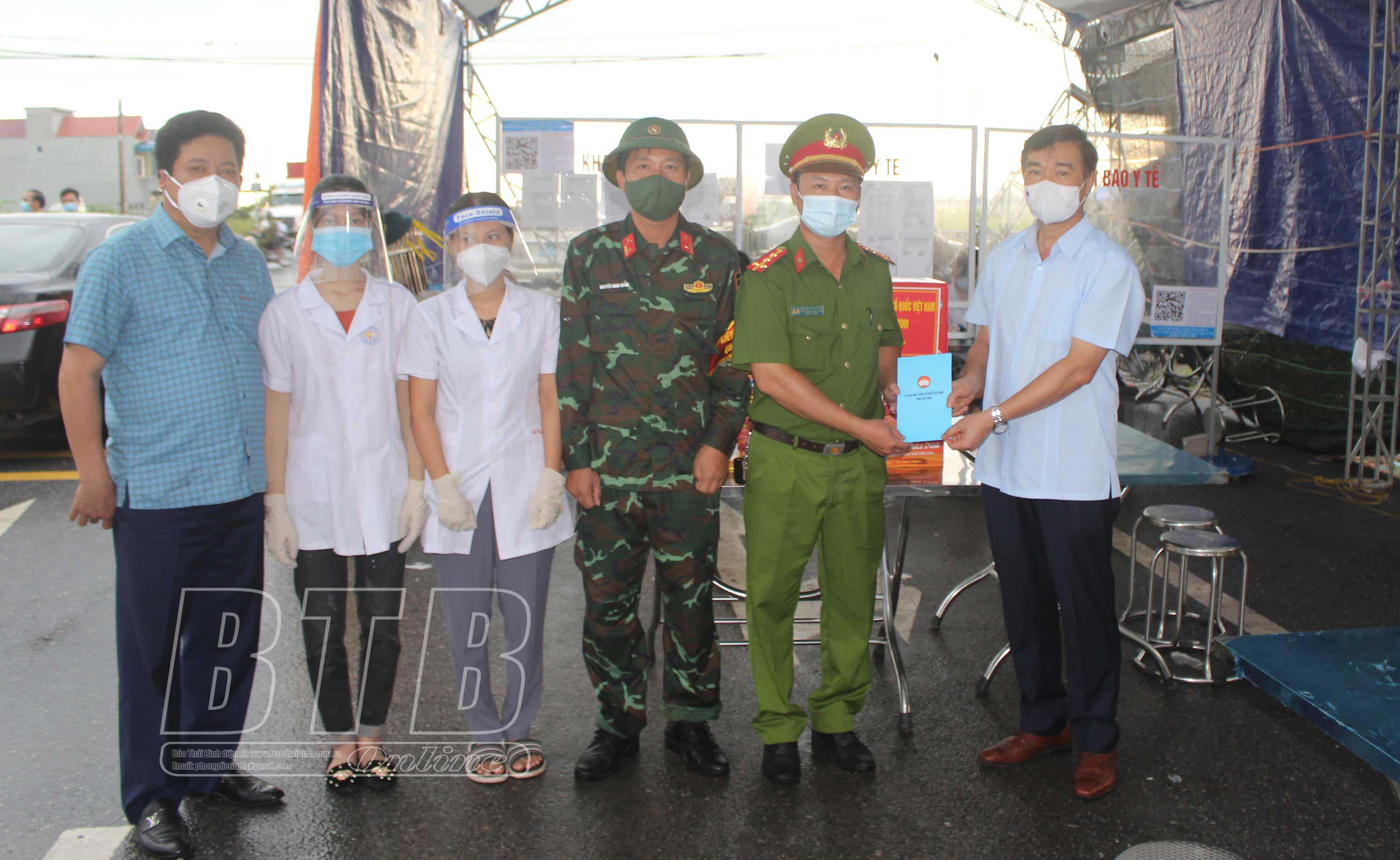 Đồng chí Nguyễn Văn Giang, Trưởng ban Dân vận Tỉnh ủy, Chủ tịch Ủy ban MTTQ tỉnh thăm, tặng quà chốt kiểm soát dịch Covid-19 và khu cách ly tập trung huyện Hưng Hà