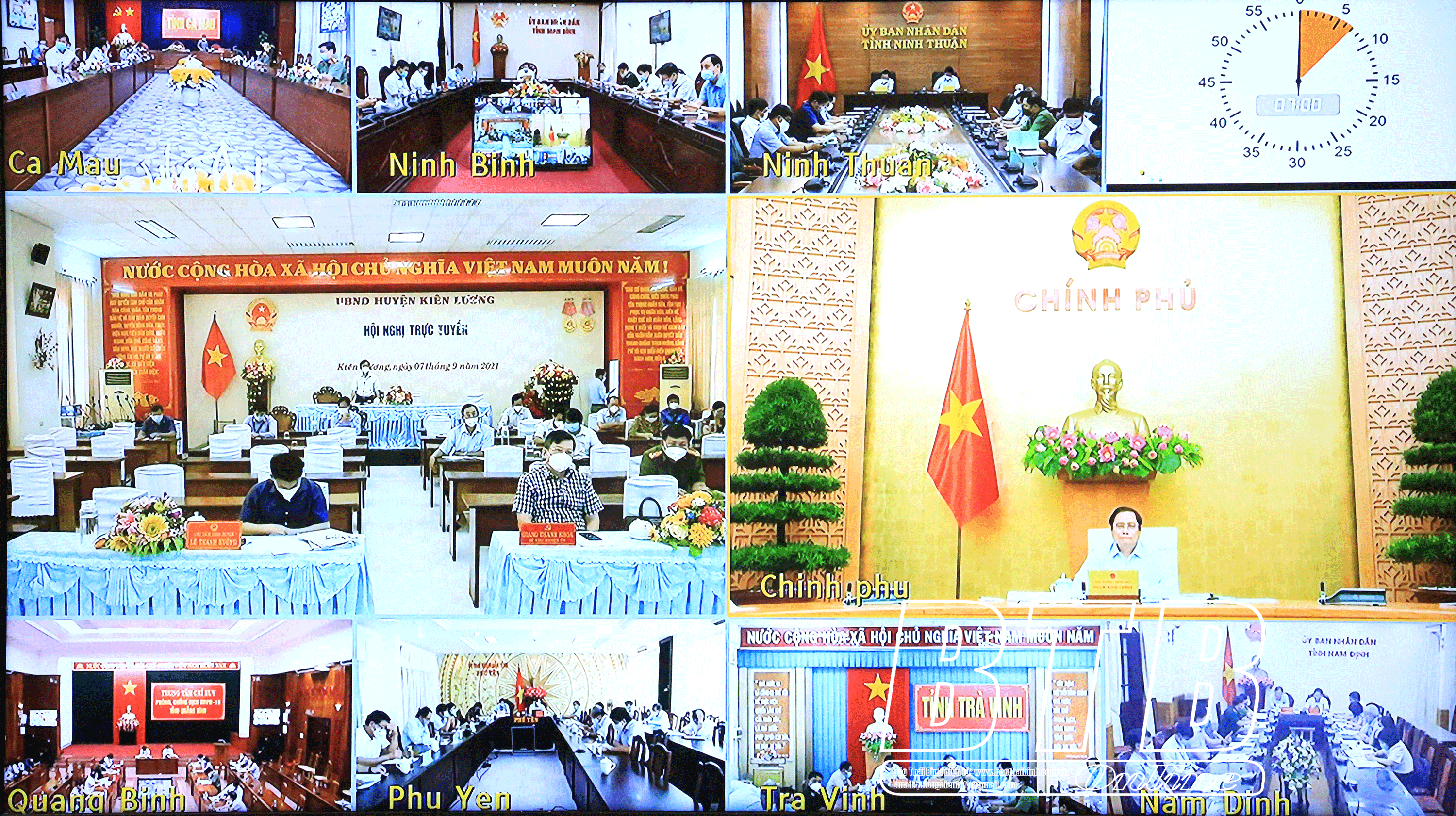 Đồng chí Ngô Đông Hải, Ủy viên Ban Chấp hành Trung ương Đảng, Bí thư Tỉnh ủy và đồng chí Nguyễn Khắc Thận, Phó Bí thư Tỉnh ủy, Chủ tịch UBND tỉnh dự hội nghị trực tuyến tại điểm cầu tỉnh Thái Bình.