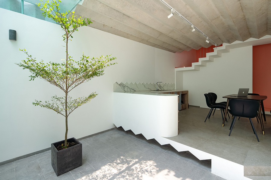 Chức năng sử dụng ở tầng trệt được bố trí tối thiểu, lùi về sau để nhường diện tích cho khoản sân nhỏ. Đây cũng là nơi gia chủ dự tính mở một hàng ăn nhỏ trong tương lai gần.