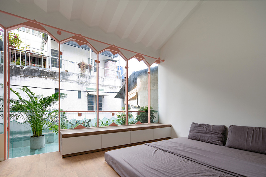 Được xây dựng cho một bạn nữ sống cùng bố mẹ đã về hưu, ngoài những nhu cầu sinh hoạt cơ bản, căn nhà cần một không gian nhỏ cho sở thích đọc sách, vẽ tranh, chơi nhạc... “gác xép” này tạo ra từ sự chênh lệch cao độ giữa khối vệ sinh và khối phòng ngủ.
