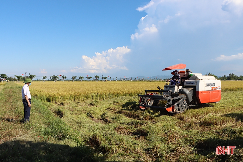 Thu hoạch trên vùng sản xuất lúa hữu cơ 20 ha ở thôn Đông Nam Lý, xã Cẩm Bình