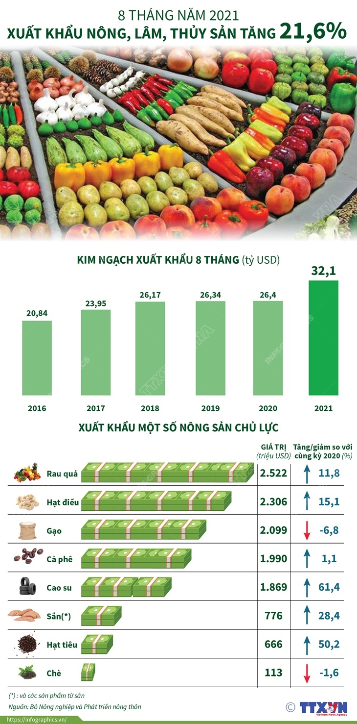 Trong 8 tháng năm 2021, xuất khẩu nông, lâm, thủy sản ước đạt 32,1 tỷ USD, tăng 21,6% so với cùng kỳ năm 2020.