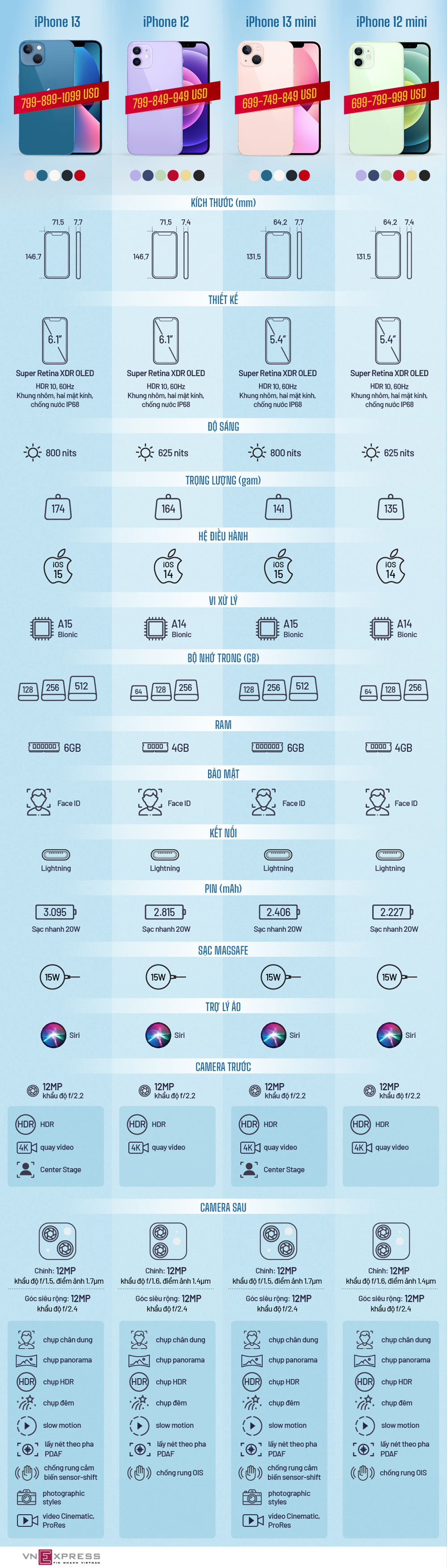 iPhone 13 và 13 mini được cải tiến khả năng chụp ảnh, nâng dung lượng pin và dùng chip xử lý mạnh hơn so với thế hệ trước.