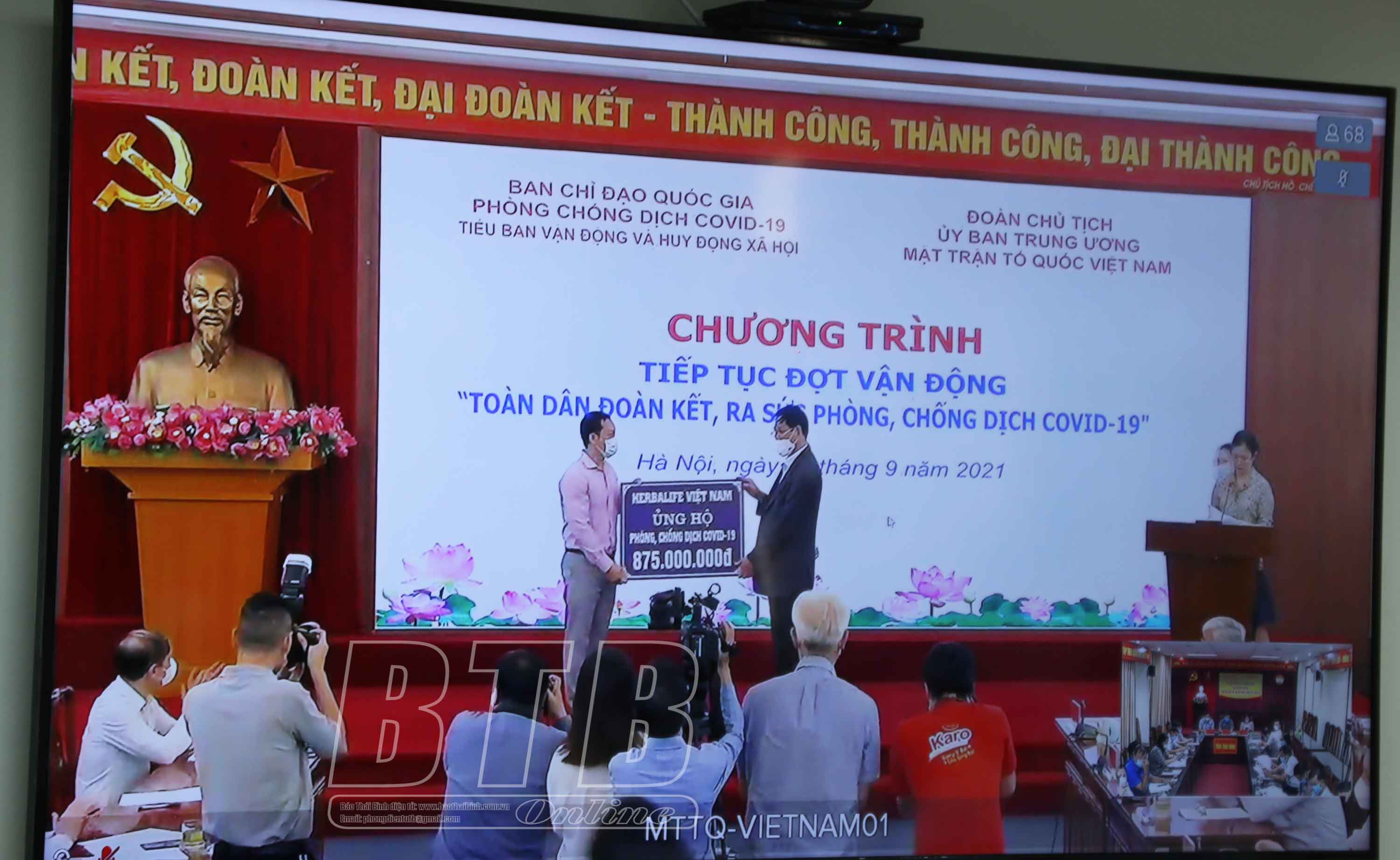Sáng ngày 16/9, tại Hà Nội, Đoàn Chủ tịch Ủy ban Trung ương MTTQ Việt Nam và Tiểu ban Vận động và Huy động xã hội thuộc Ban Chỉ đạo Quốc gia phòng, chống dịch Covid-19 tổ chức chương trình trực tuyến tiếp tục đợt vận động Toàn dân đoàn kết, ra sức phòng, chống dịch Covid-19.