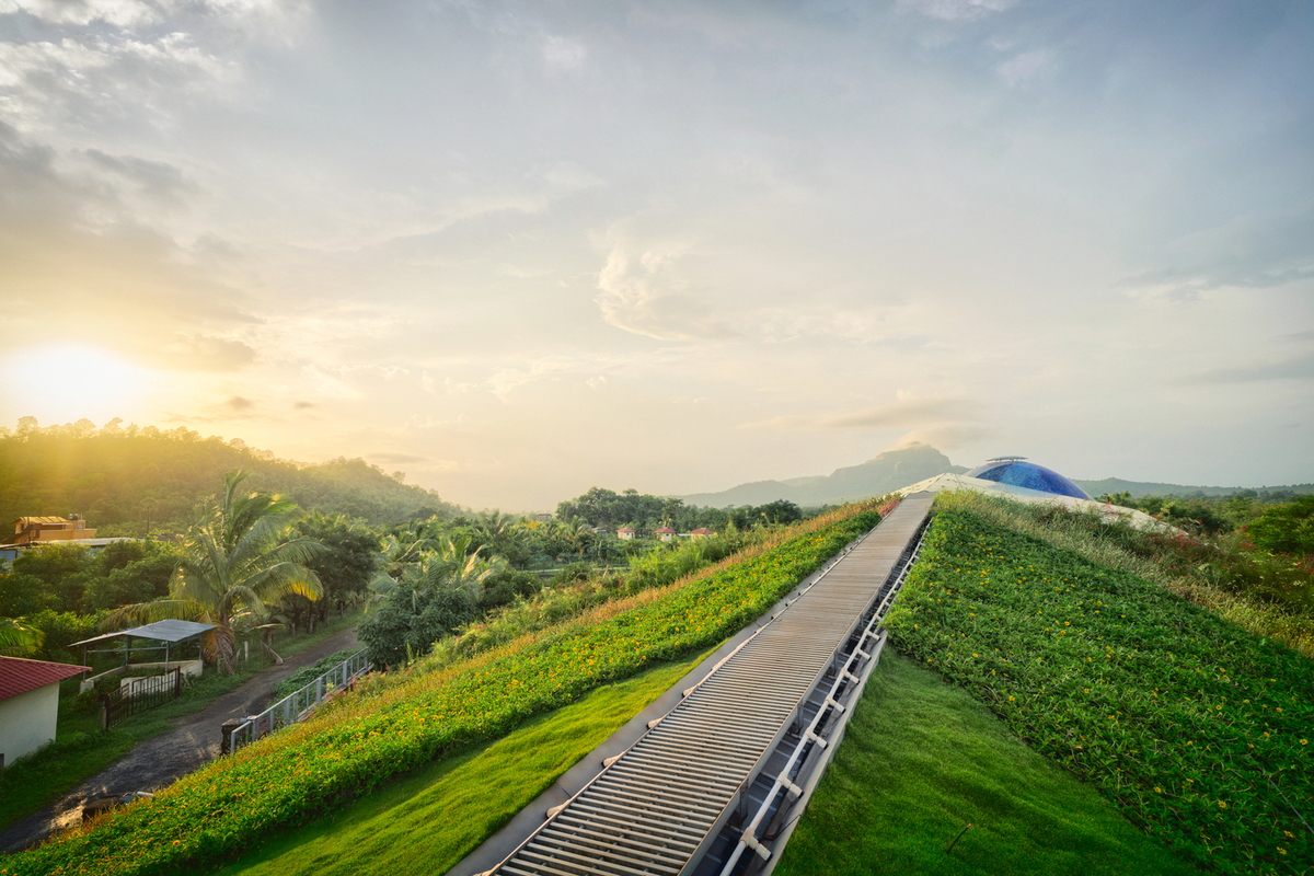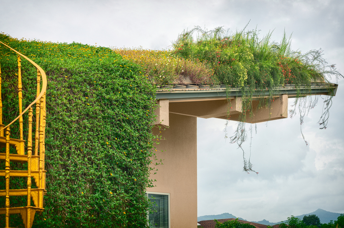Để hòa hợp với bối cảnh xung quanh, đồng thời thu hút các loài chim và côn trùng, mái nhà được phủ xanh toàn bộ với nhiều loại hoa, cỏ.