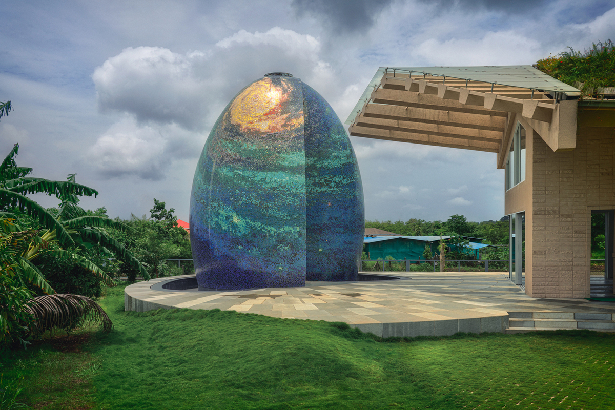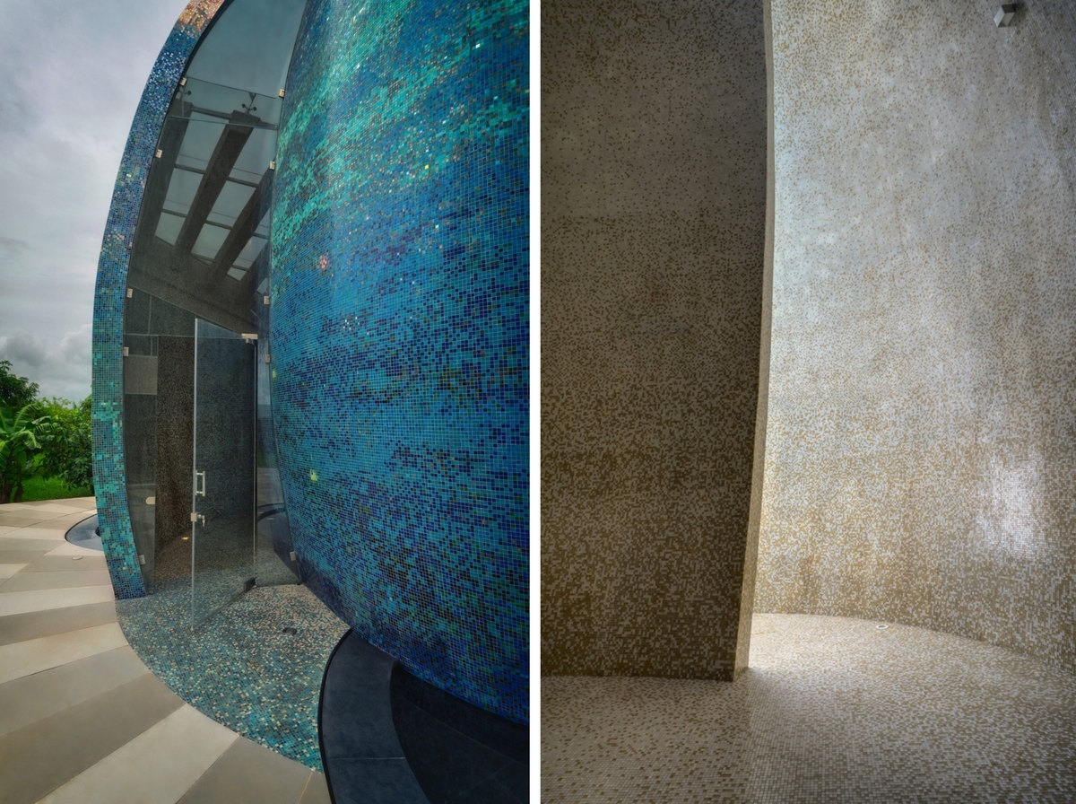 Điểm đặc biệt của căn nhà là khu thờ hình quả trứng trang trí bằng gạch mosaic lấp lánh.