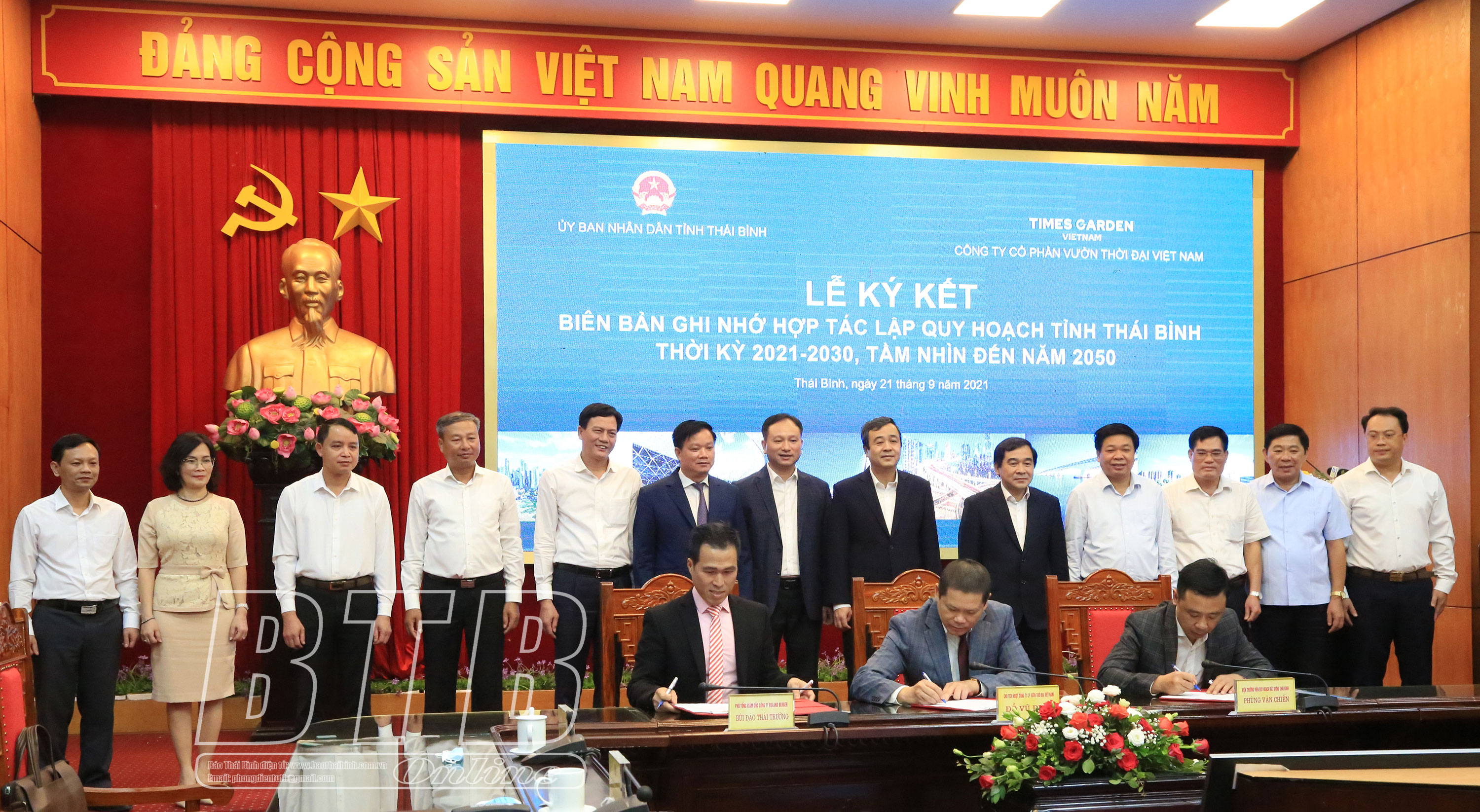 Tại hội nghị đã diễn ra lễ ký kết biên bản ghi nhớ hợp tác giữa UBND tỉnh và Công ty Cổ phần Vườn Thời Đại Việt Nam về việc lập Quy hoạch tỉnh Thái Bình thời kỳ 2021-2030, tầm nhìn đến năm 2050, ký kết biên bản thỏa thuận hợp tác tham gia lập quy hoạch tỉnh Thái Bình thời kỳ 2021 - 2030, tầm nhìn đến năm 2050 giữa liên danh các đơn vị tư vấn trong nước và nước ngoài.