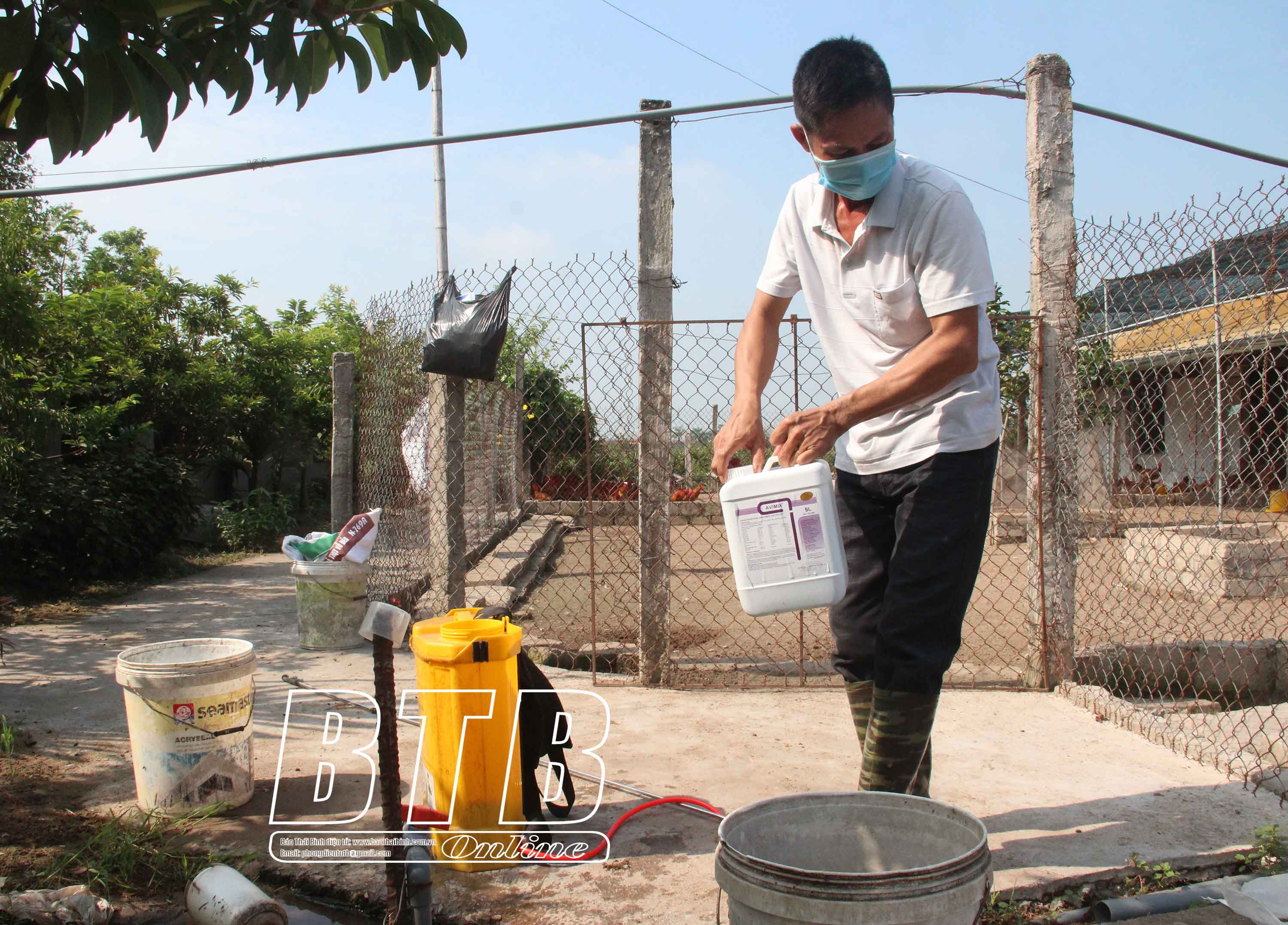 Ông Vũ Viết Sơn, xã Quỳnh Hoàng (Quỳnh Phụ) định kỳ phun vệ sinh tiêu độc khử trùng cho chuồng trại.