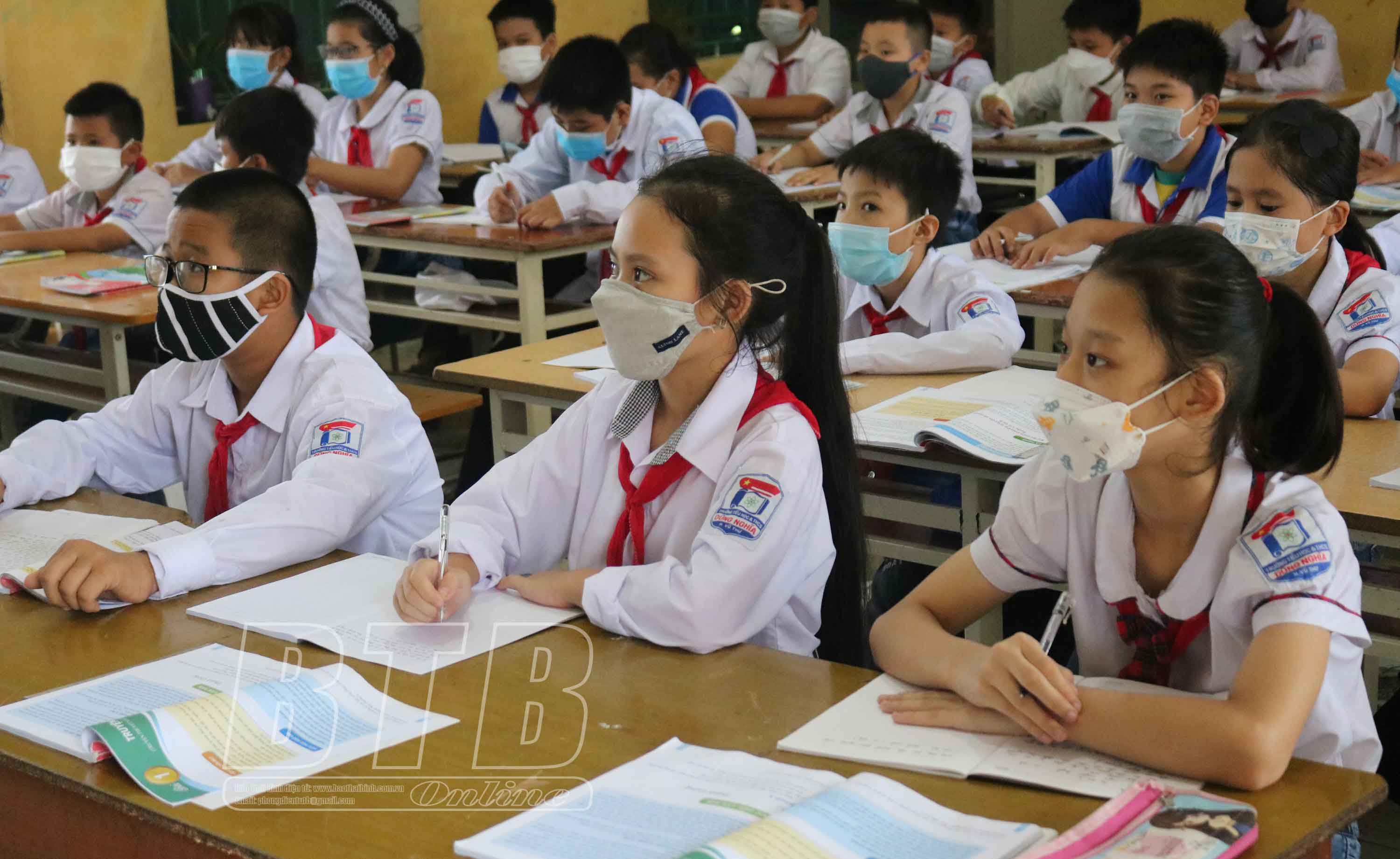 Học sinh lớp 6, Trường Tiểu học và THCS Dũng Nghĩa (Vũ Thư) tập trung tiếp thu kiến thức trên lớp.