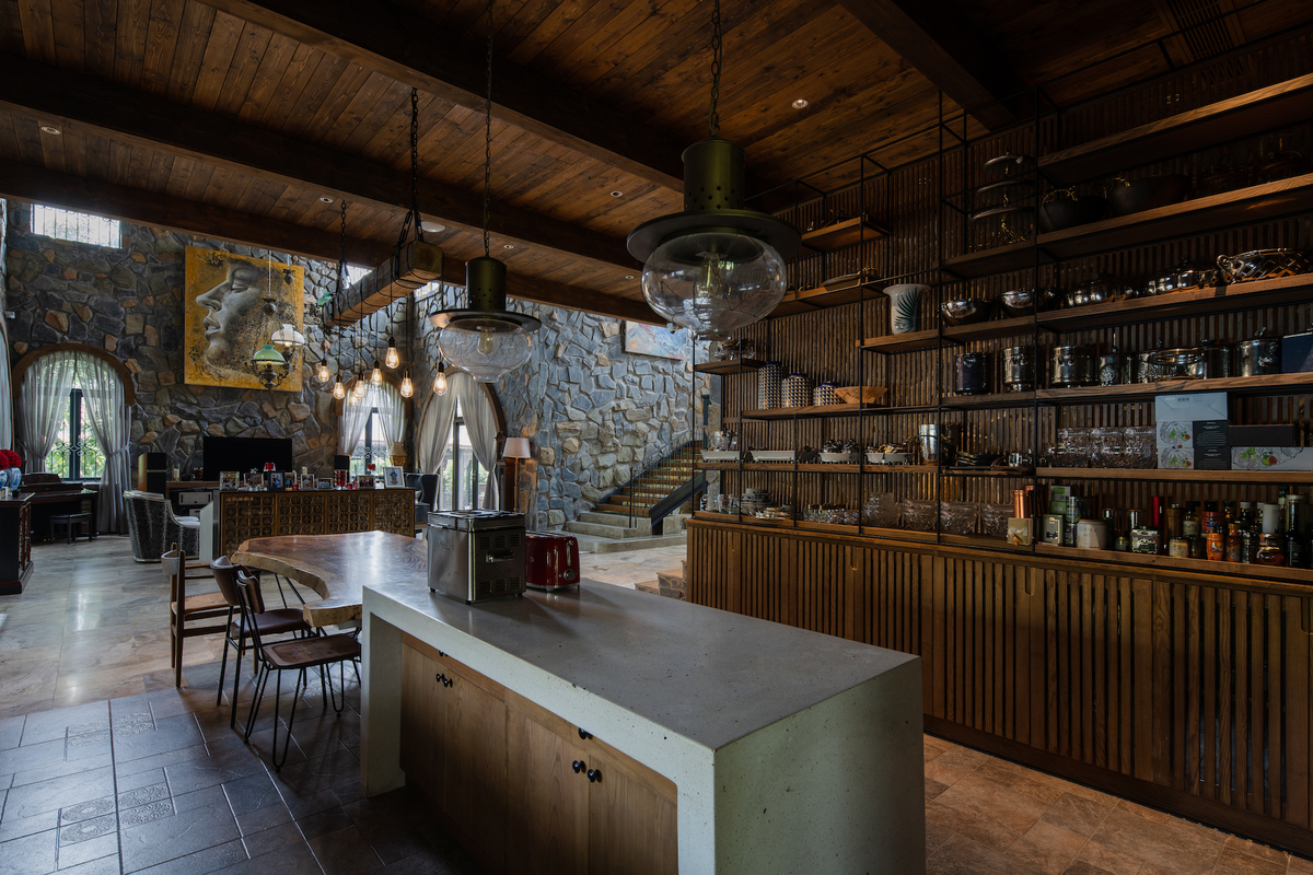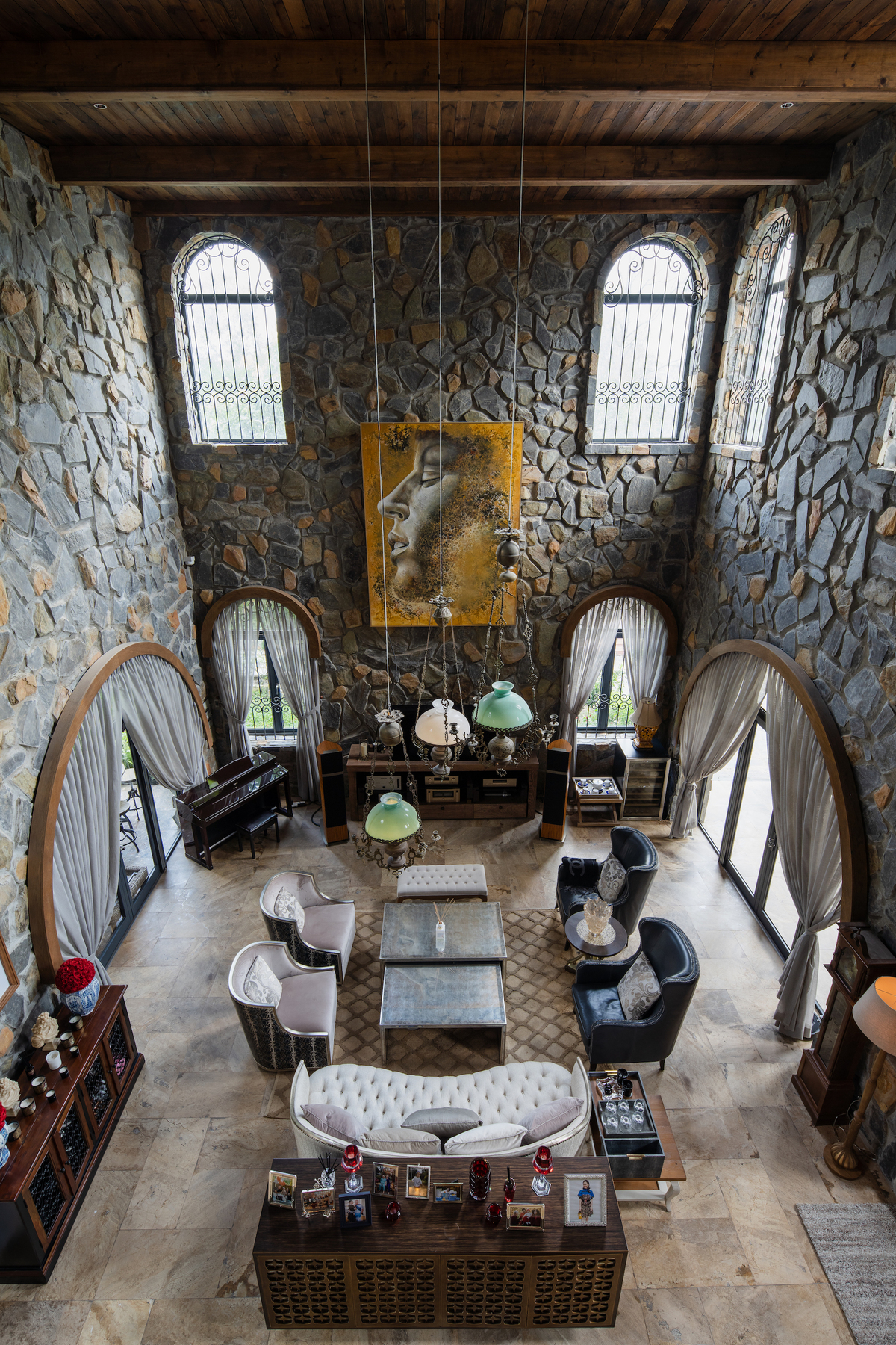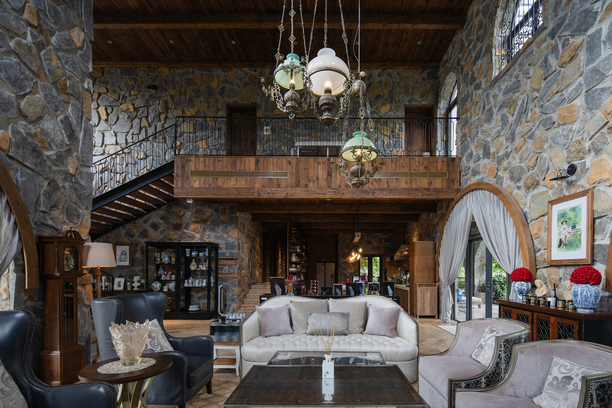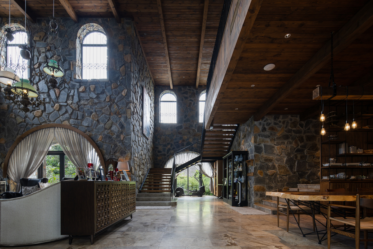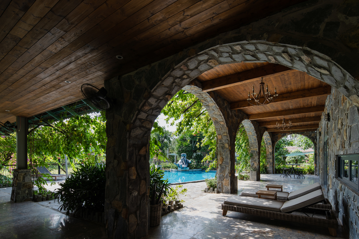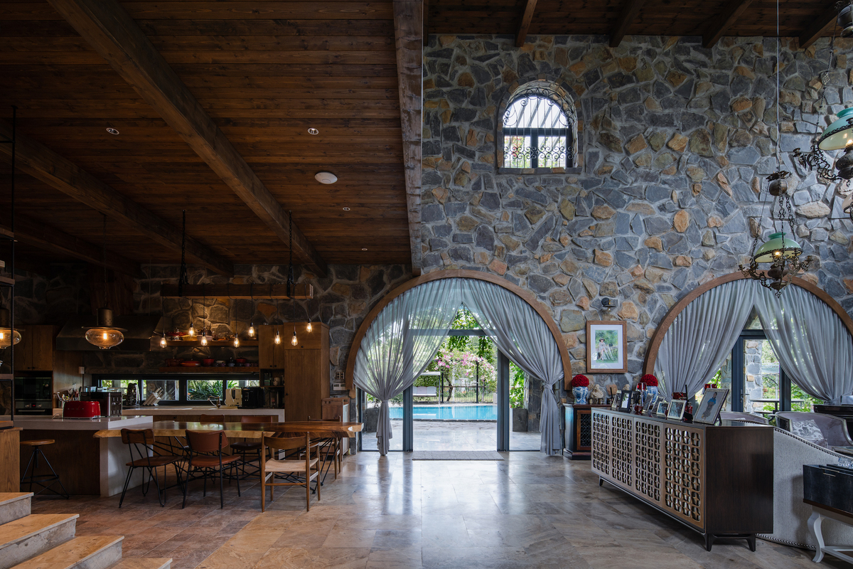 Căn nhà lấy cảm hứng từ kiến trúc Pháp, cũng là đam mê của chủ nhà. Các chi tiết như cửa vòm, tường đá, trần gỗ, đèn chùm... gợi nhớ đến những tòa lâu đài cổ.