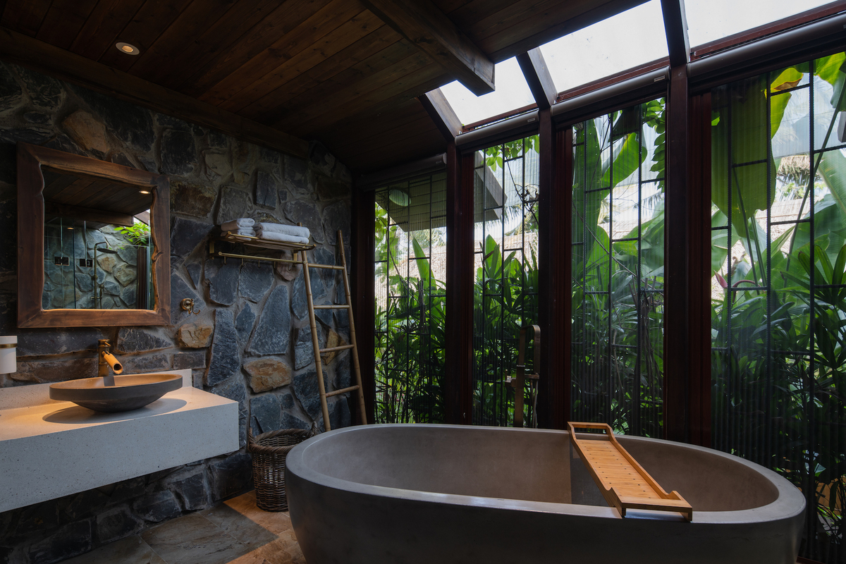 Khu vệ sinh mở, giao hoà với thiên nhiên, được bao bọc bởi cây cối.