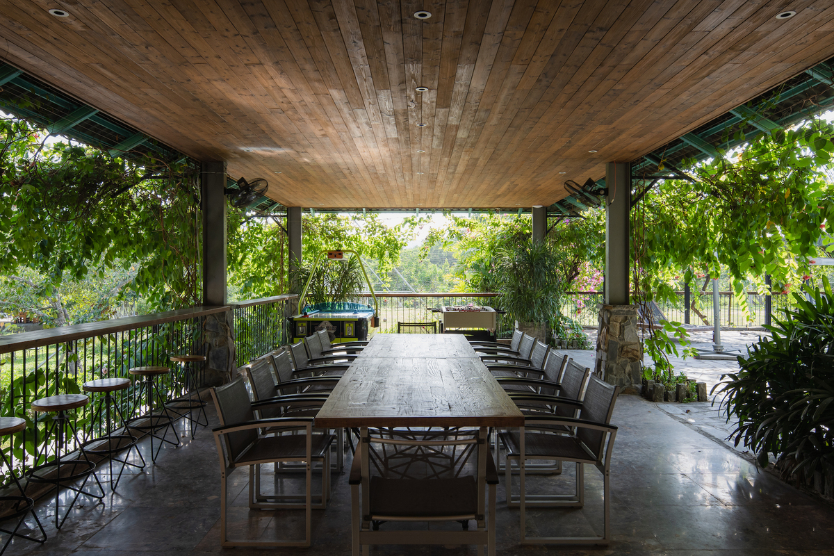 Để tăng độ mát cho căn nhà, gia chủ và kiến trúc sư trồng thêm giàn dây leo tại các hành lang hướng Tây. Khu vực này cũng được tận dụng làm khu ăn uống ngoài trời.