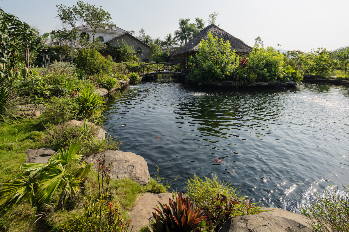 Trên khu đất còn có một hồ nuôi cá Koi. Giữa hồ là mái nhà tranh bằng khung sắt chịu lực, tre nứa cùng lá dừa và chiếc cầu tre bắc qua.