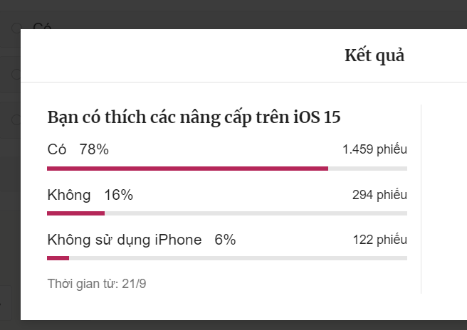 Trong khảo sát ngày 21/9 của VnExpress, có gần 80% người bình chọn cho biết thích các nâng cấp trên hệ điều hành iOS 15. Phiên bản hệ điều hành mới cho iPhone, iPad không thay đổi nhiều về giao diện nhưng bổ sung các tính năng quan trọng. Trong đó, trình duyệt Safari được sắp xếp lại thanh địa chỉ, thêm tính năng đọc văn bản trong ảnh, thông tin Exif của ảnh chụp, nâng cấp giao diện cho bản đồ, thời tiết...