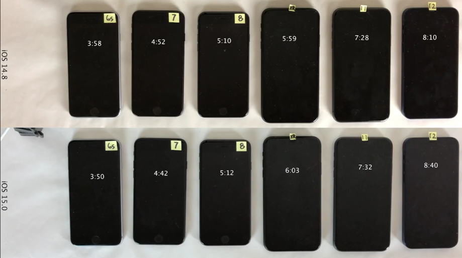 Thử nghiệm thời lượng pin của iPhone 11, iPhone 12 chạy iOS 15 tốt hơn iOS 14.8. Ảnh: UltimateiDeviceVids