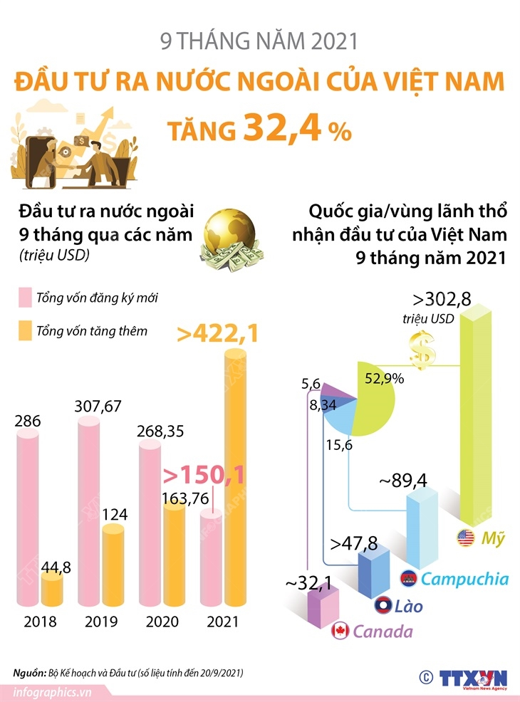 9 tháng năm 2021, tổng vốn đầu tư của Việt Nam ra nước ngoài cấp mới và tăng thêm đạt 572,3 triệu USD, tăng 32,4% so với cùng kỳ năm 2020.