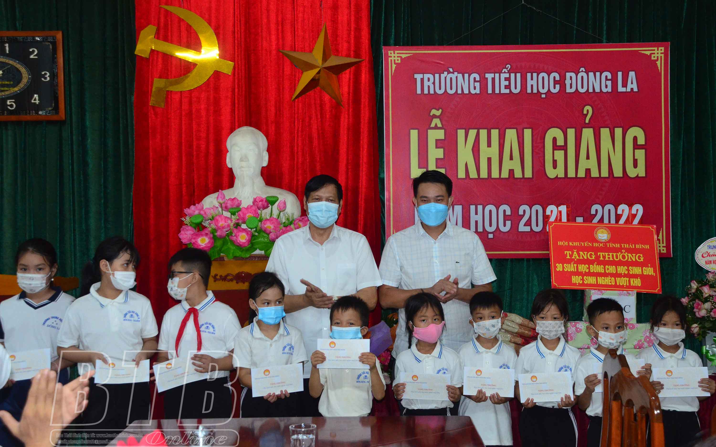 Đại diện Hội Khuyến học tỉnh trao học bổng cho học sinh Trường Tiểu học Đông La (Đông Hưng) nhân dịp đầu năm học mới.