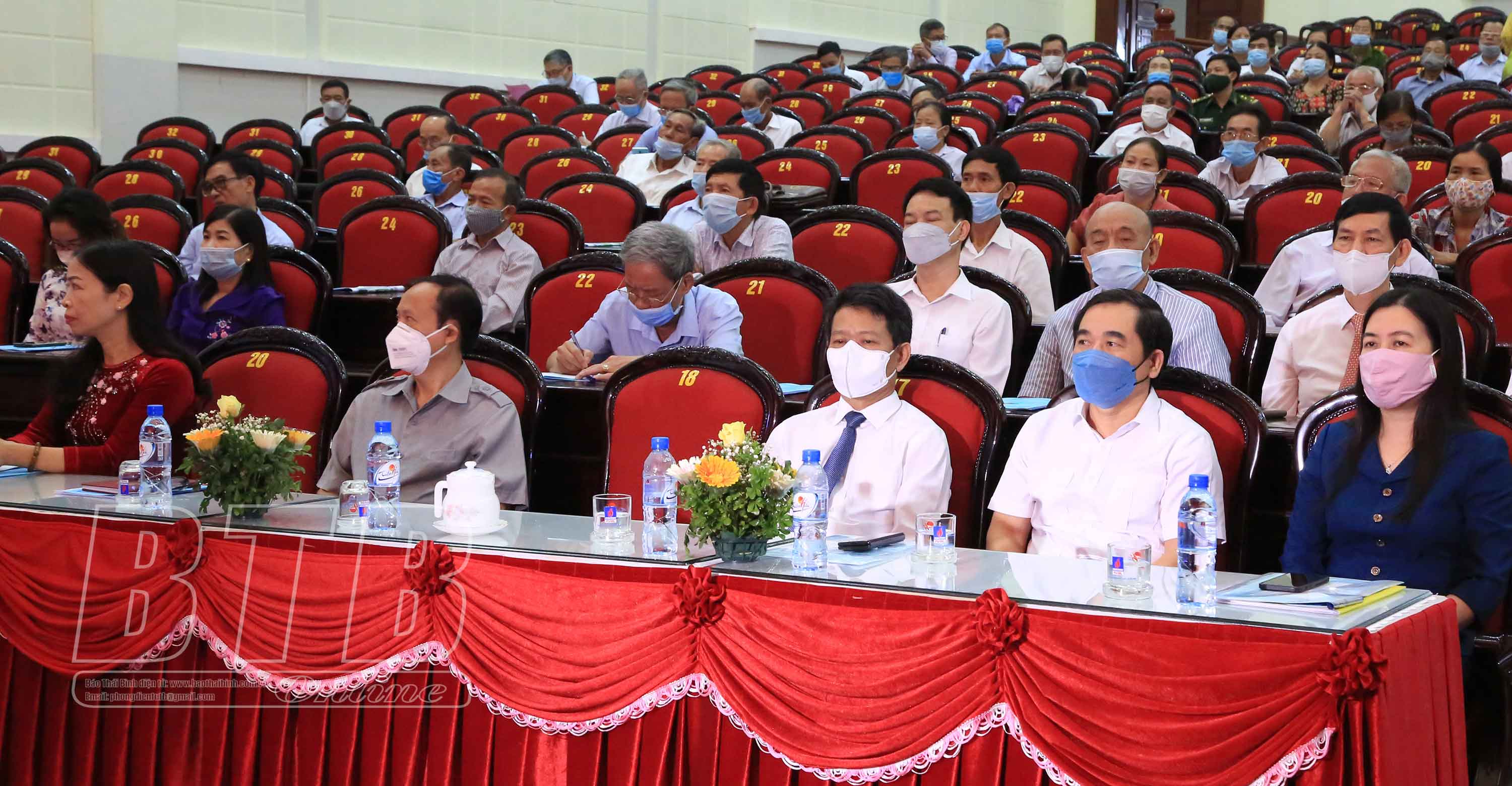 Các đồng chí: Nguyễn Tiến Thành, Phó Bí thư thường trực Tỉnh ủy, Chủ tịch HĐND tỉnh; Nguyễn Văn Giang, Ủy viên Ban Thường vụ, Trưởng ban Dân vận Tỉnh ủy, Chủ tịch Ủy ban MTTQ tỉnh; Hoàng Văn Thành, Ủy viên Ban Thường vụ Tỉnh ủy, Bí thư Thành ủy, Chủ tịch HĐND thành phố Thái Bình; Trần Thị Bích Hằng, Tỉnh ủy viên, Phó Chủ tịch UBND tỉnh dự hội nghị.