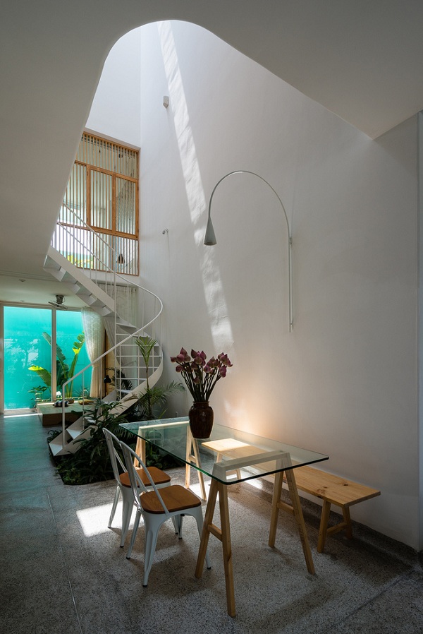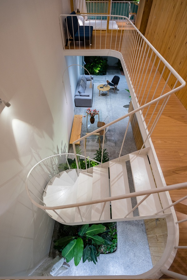 Cầu thang xoắn và gầm được tận dụng trồng cây.