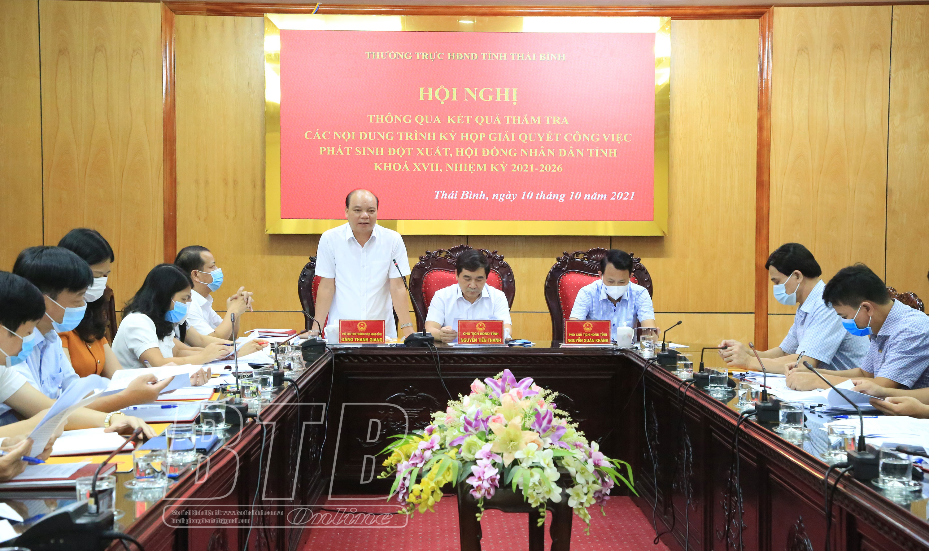 Tại cuộc họp, sau khi nghe các ban HĐND tỉnh báo cáo kết quả thẩm tra, đại biểu thảo luận, tham gia đóng góp ý kiến, đồng chí Nguyễn Tiến Thành, Phó Bí thư thường trực Tỉnh ủy, Chủ tịch HĐND tỉnh cơ bản thống nhất với nội dung kết quả thẩm tra các tờ trình, dự thảo nghị quyết UBND tỉnh trình HĐND tỉnh liên quan đến lĩnh vực đất đai; đầu tư công, đầu tư công trung hạn; cải tạo, nâng cấp một số tuyến đường; cơ chế, chính sách hỗ trợ xây dựng hệ thống đèn điện “Thắp sáng đường quê” trong xây dựng nông thôn mới giai đoạn 2021 - 2025; chế độ, định mức chi tiêu tài chính phục vụ hoạt động của HĐND các cấp tỉnh Thái Bình; xây dựng cơ sở hạ tầng Trung tâm giám sát điều hành đô thị thông minh và xây dựng phần mềm nền tảng đô thị thông minh tỉnh…