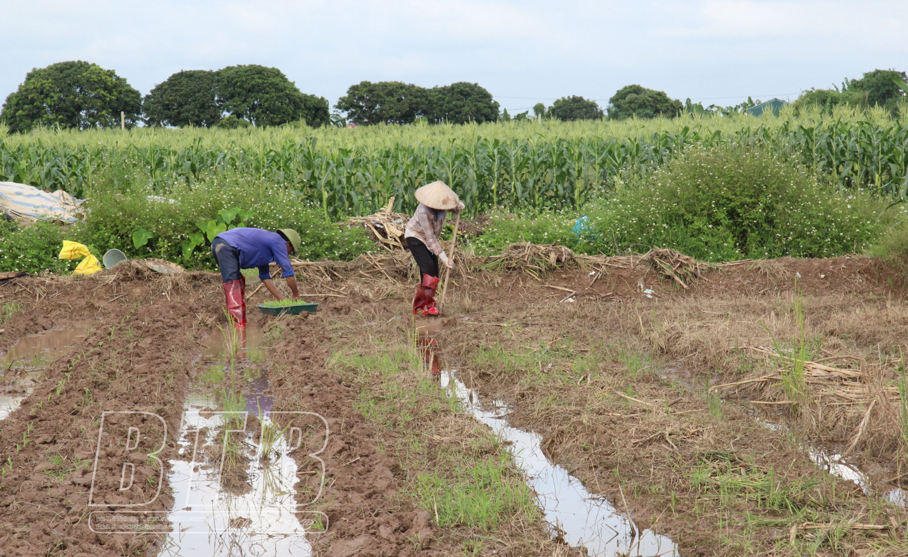 Nông dân xã Điệp Nông, Hưng Hà vun luống và khơi thông rãnh nước bảo vệ cây vụ đông. Ảnh: Thanh Thủy