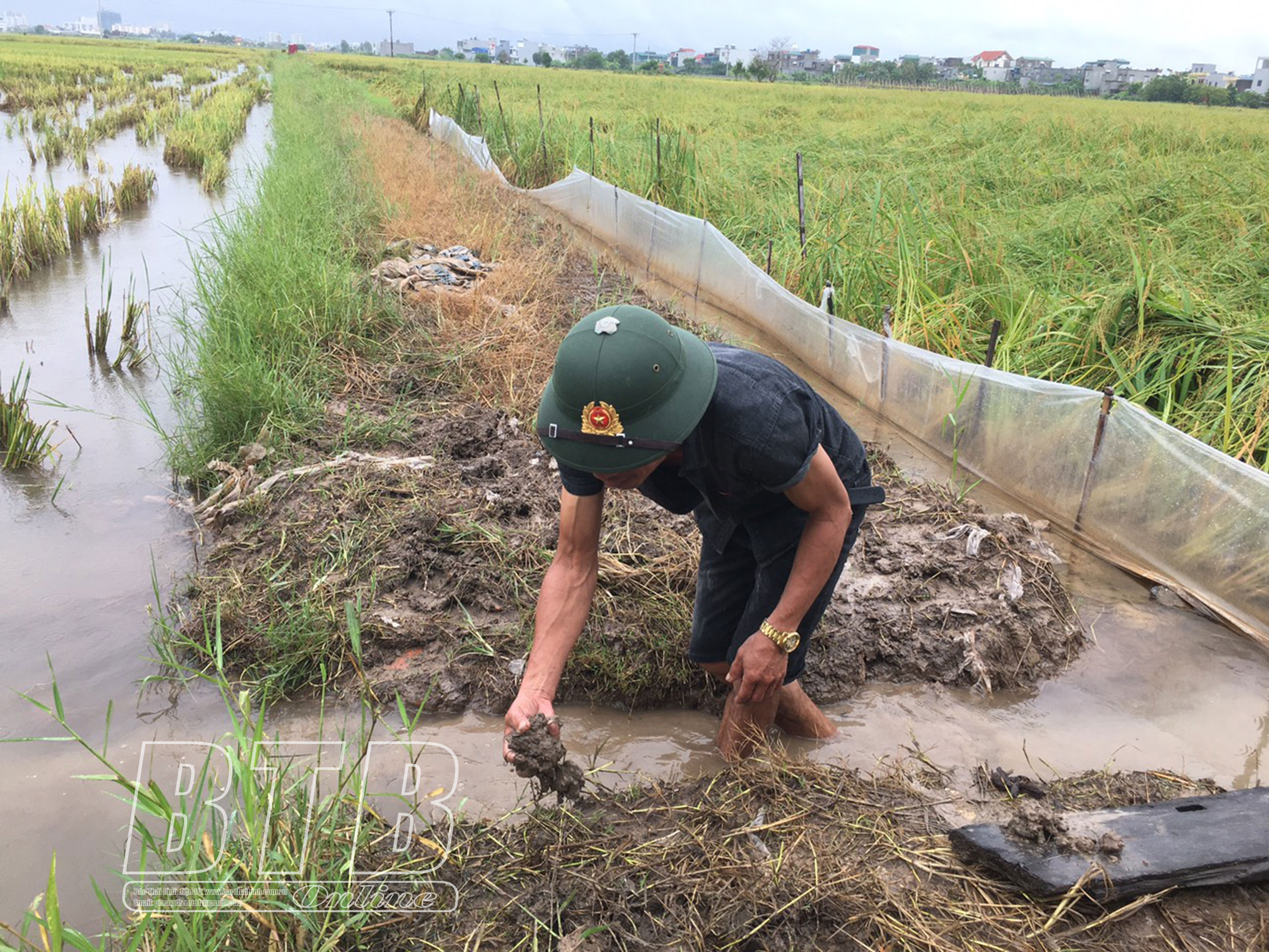 Kiểm tra, giải tỏa các ách tắc, tiêu thoát nước mặt ruộng để bảo vệ diện tích lúa mùa chưa thu hoạch tại Vũ Thư. Ảnh: Quỳnh Lưu
