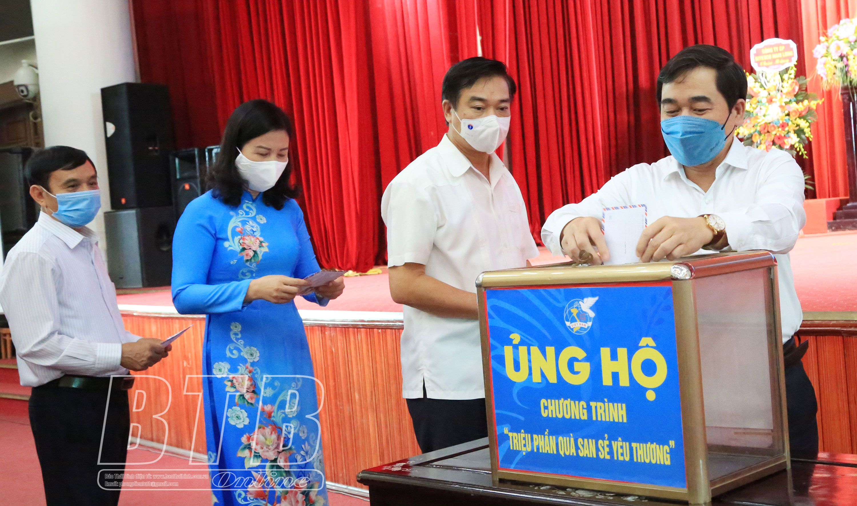 Các đồng chí: Nguyễn Tiến Thành, Phó Bí thư thường trực Tỉnh ủy, Chủ tịch HĐND tỉnh; Nguyễn Văn Giang, Ủy viên Ban Thường vụ, Trưởng ban Dân vận Tỉnh ủy, Chủ tịch Ủy ban MTTQ tỉnh ủng hộ chương trình ''Triệu phần quà - San sẻ yêu thương''.