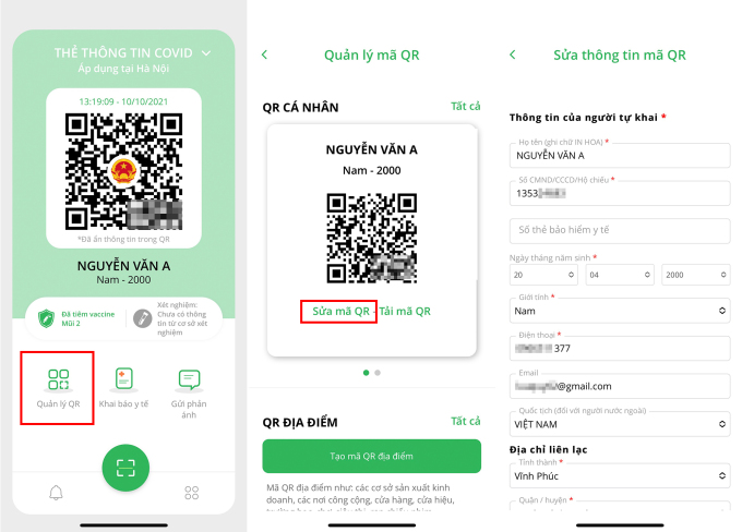 Người dùng có thể sửa họ tên, giới tính, ngày sinh trên PC-Covid và nhận mã QR mới theo các thông tin này.