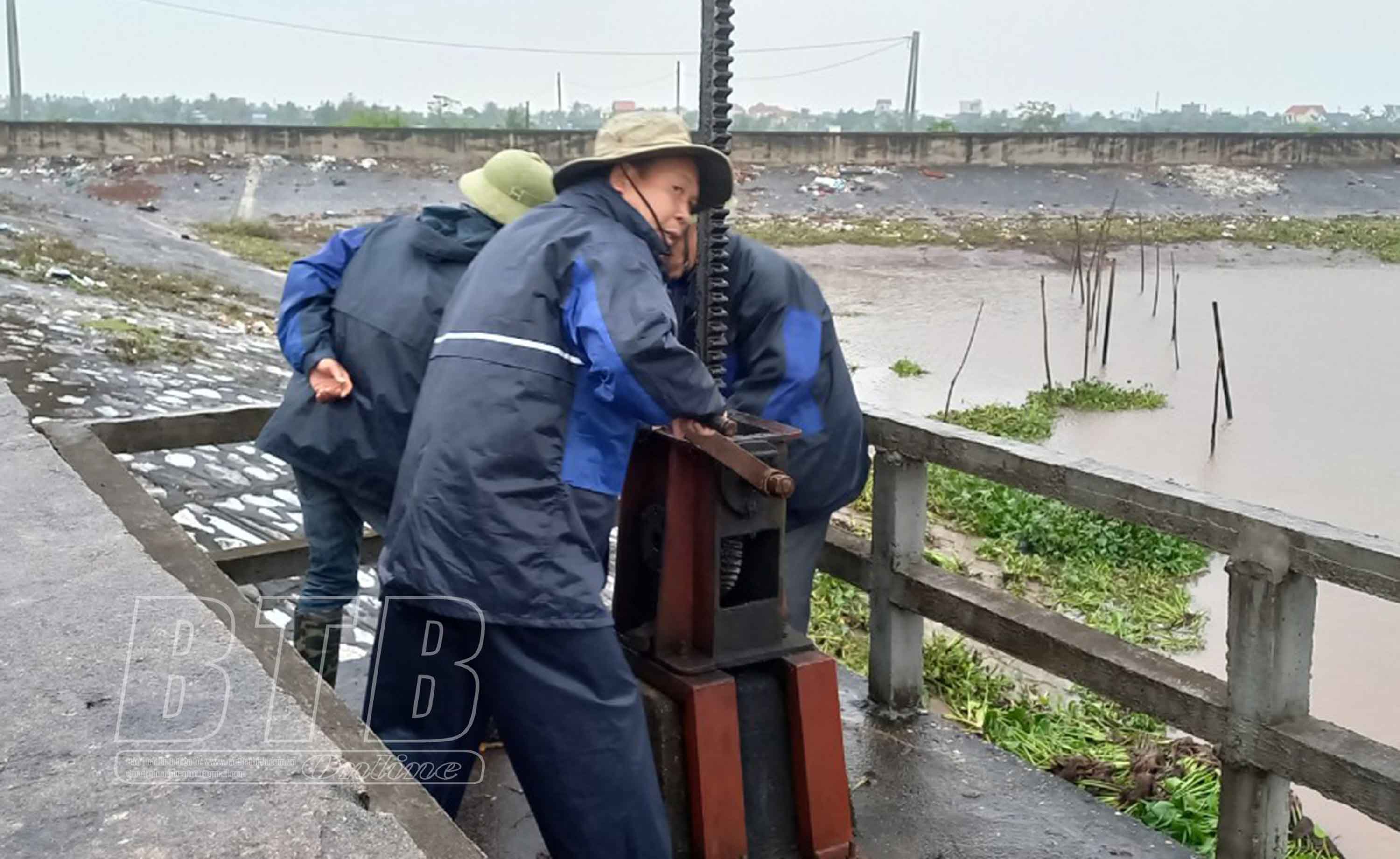 Công nhân mở van cống tiêu nước tại cống Tám Cửa (Tiền Hải).