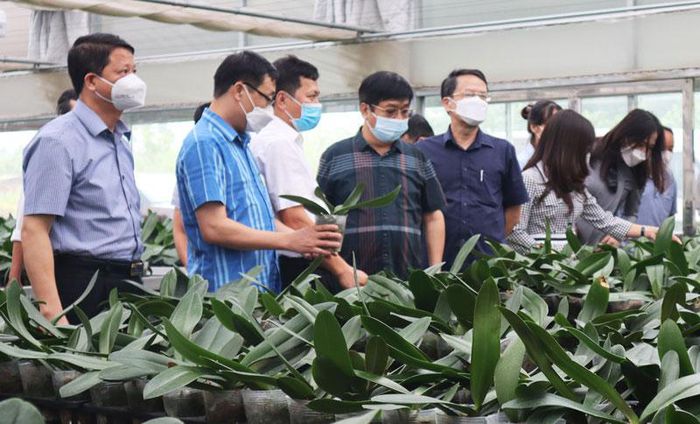 Đoàn thẩm định thành phố Hà Nội thăm mô hình trồng hoa lan ứng dụng công nghệ cao tại xã Đại Thịnh (huyện Mê Linh).