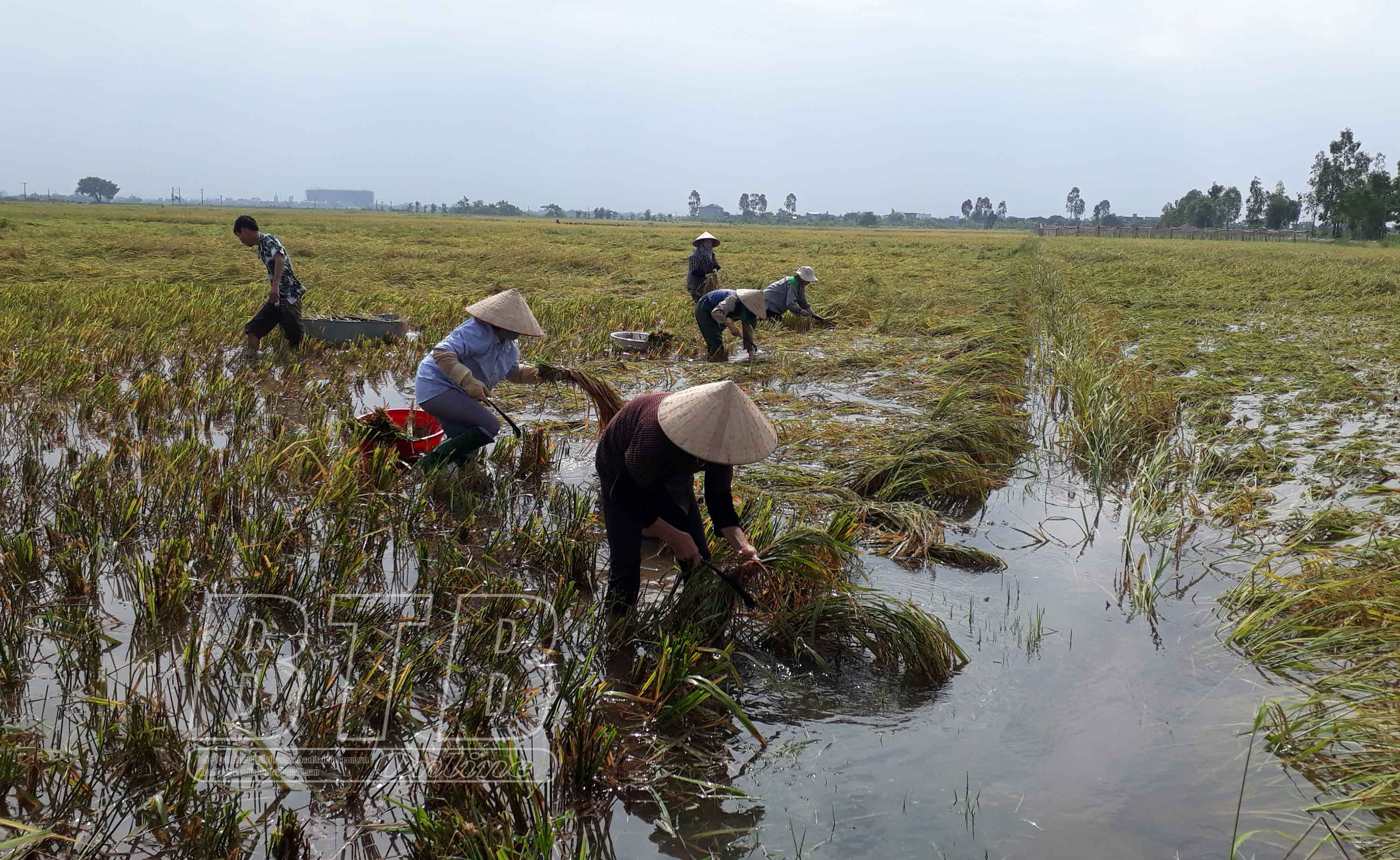 Nông dân Thái Thụy thu hoạch diện tích lúa bị đổ do mưa bão. Ảnh: Lưu Ngần