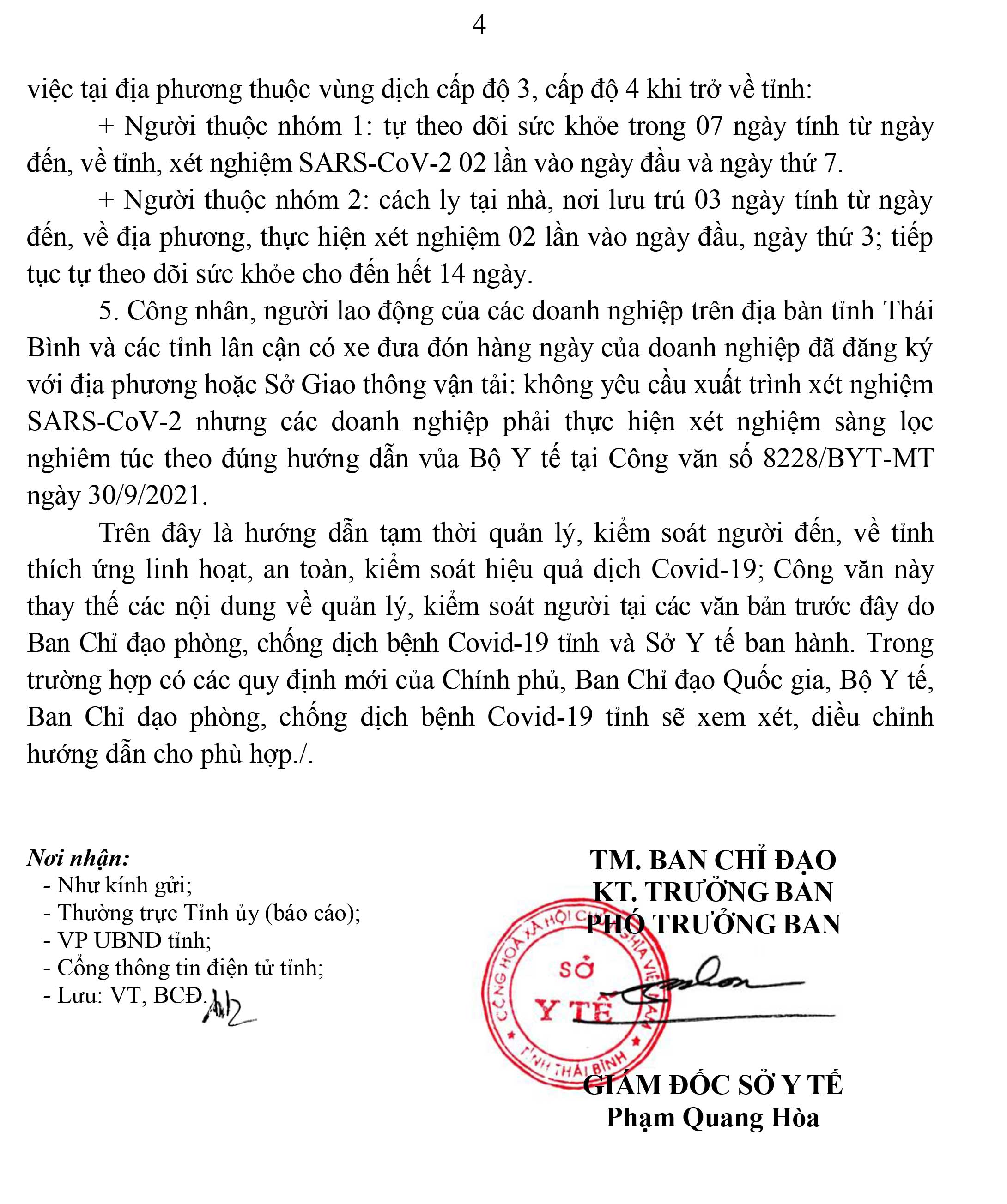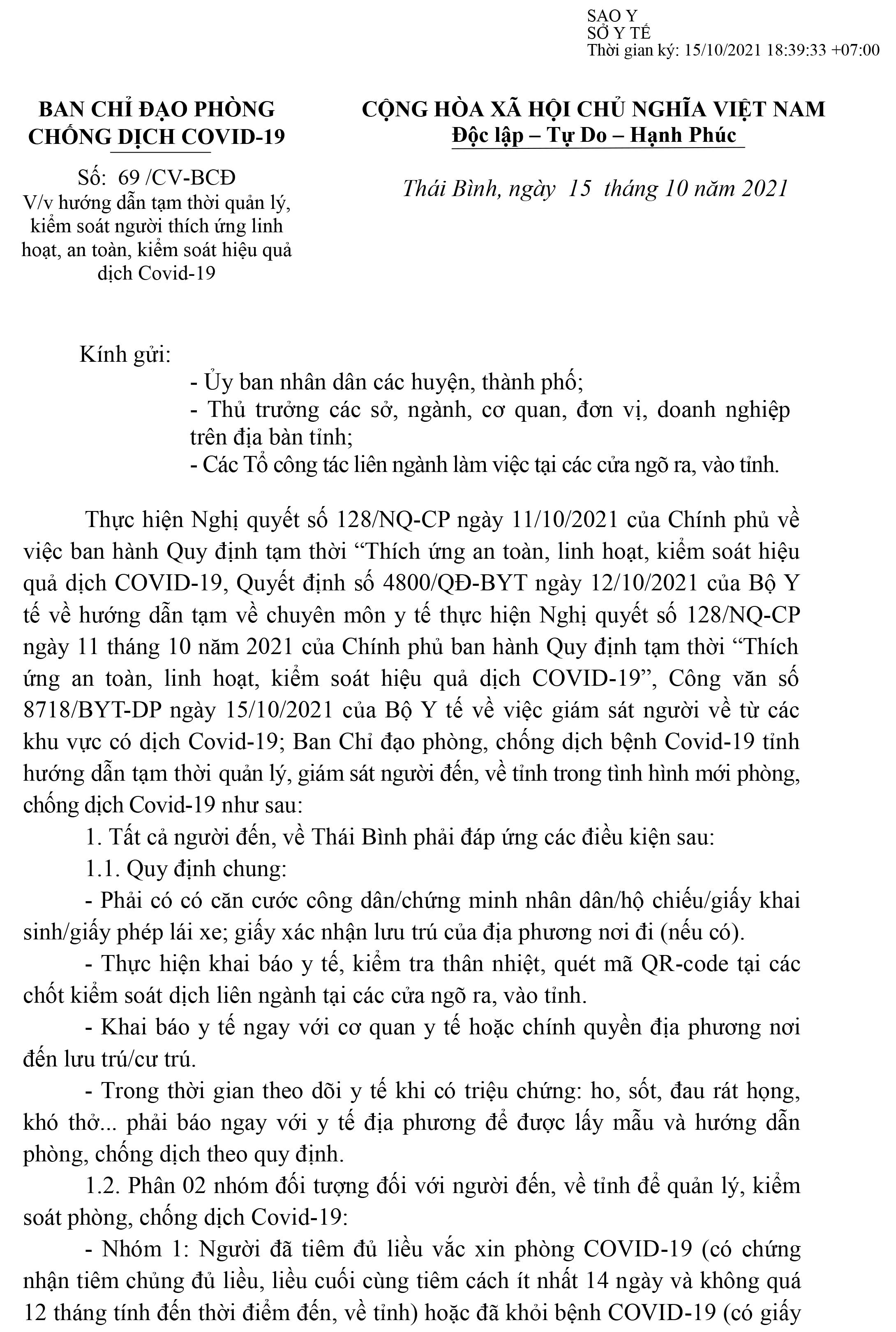 Công văn số 69/CV-BCĐ ngày 15/10/2021 của Ban Chỉ đạo phòng, chống dịch Covid-19 về việc hướng dẫn tạm thời quản lý, kiểm soát người thích ứng linh hoạt, an toàn, kiểm soát hiệu quả dịch Covid-19.