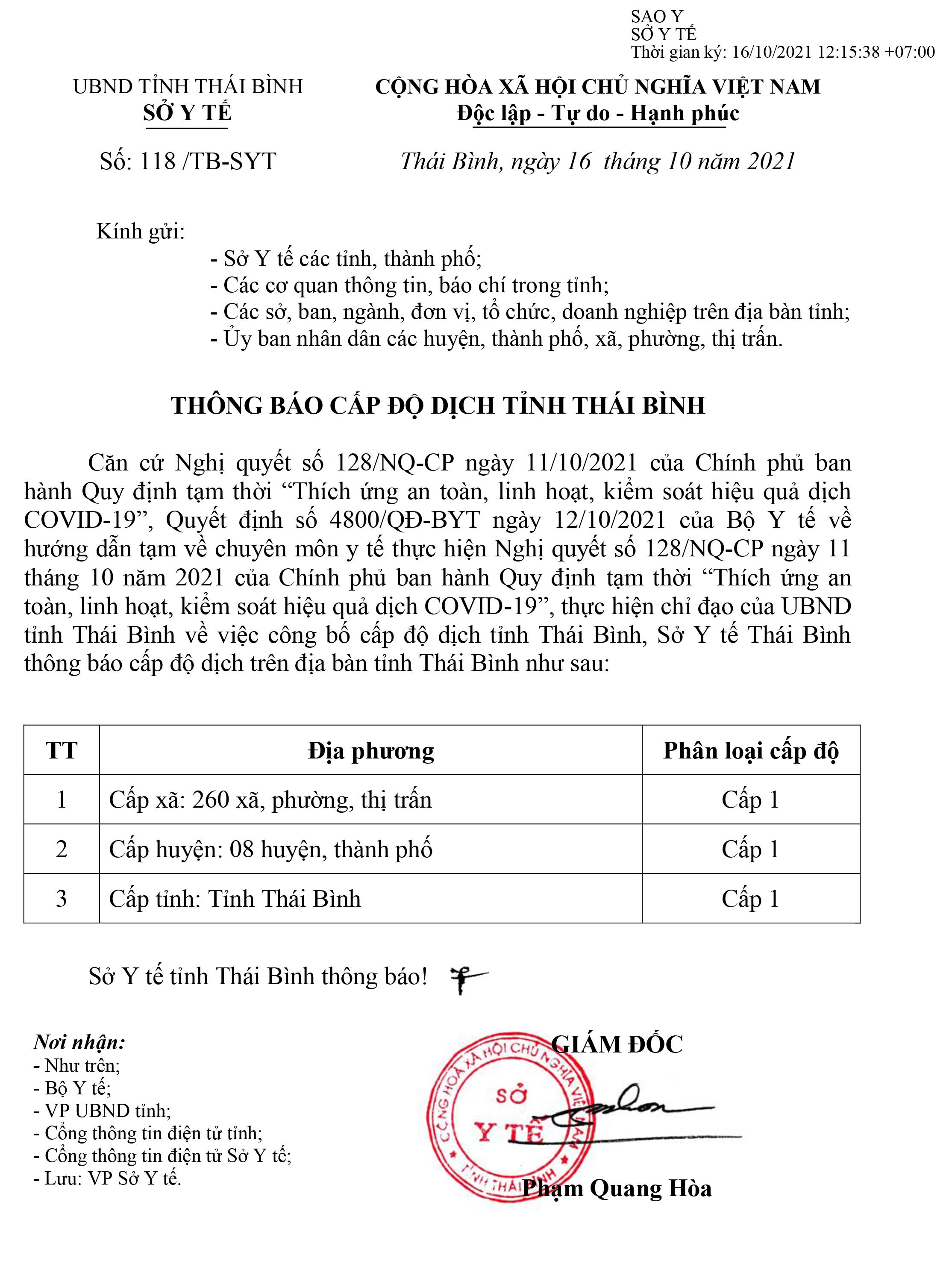 Thông báo cấp độ dịch tỉnh Thái Bình