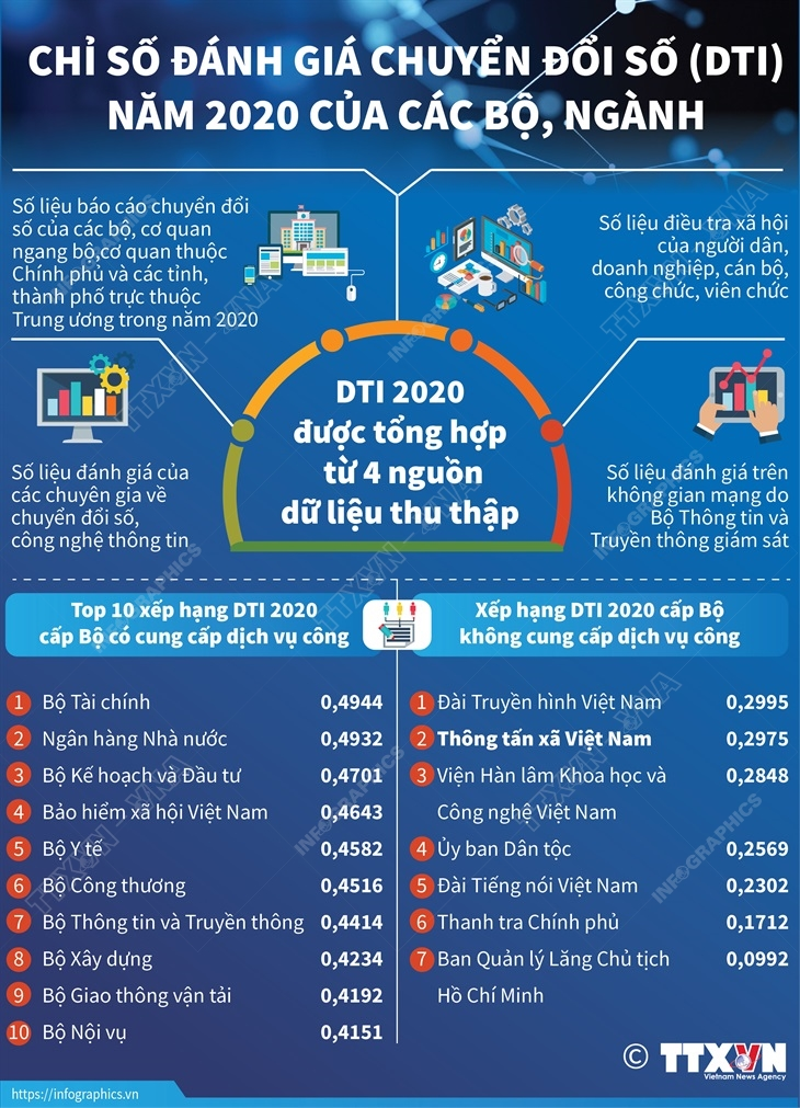 Theo báo cáo chỉ số đánh giá chuyển đổi số (DTI) 2020, Bộ Tài chính là cơ quan dẫn đầu bảng xếp hạng DTI 2020 ở khối cấp bộ cung cấp dịch vụ công trực tuyến. Theo mức điểm đánh giá, kết quả chuyển đổi số của các bộ, cơ quan ngang bộ, cơ quan thuộc Chính phủ năm 2020 đang trong giai đoạn bắt đầu. Việc chuyển đổi nhận thức và kiến tạo thể chế được thực hiện khá tốt để tạo điều kiện thuận lợi cho các cơ quan nhà nước, doanh nghiệp tham gia vào quá trình chuyển đổi số ngày càng thuận tiện.