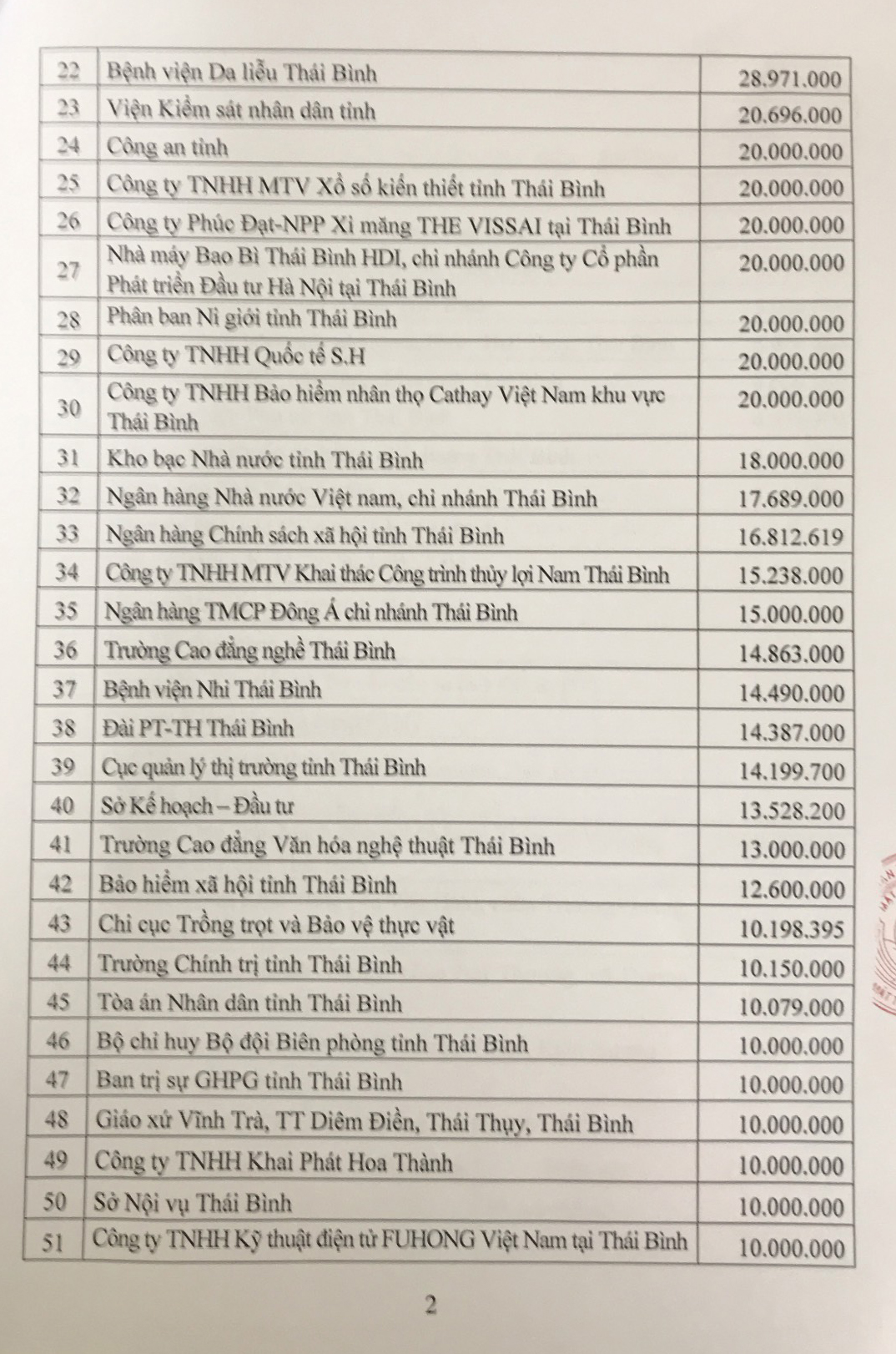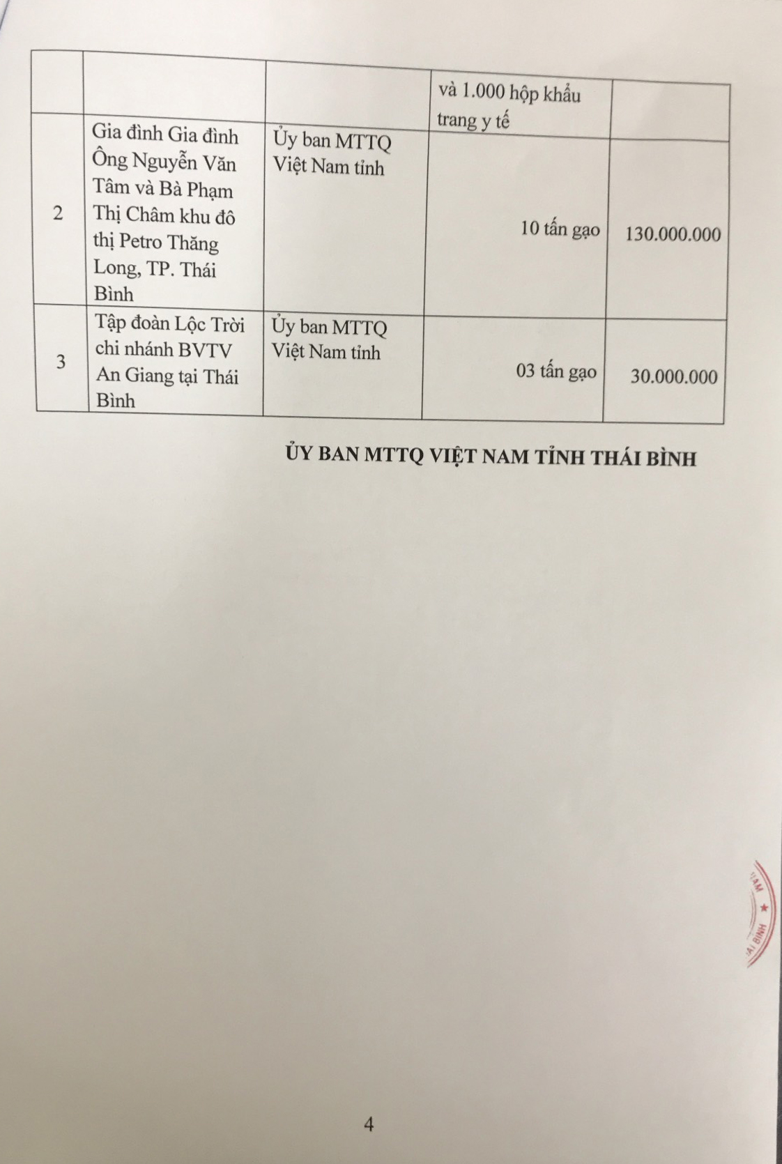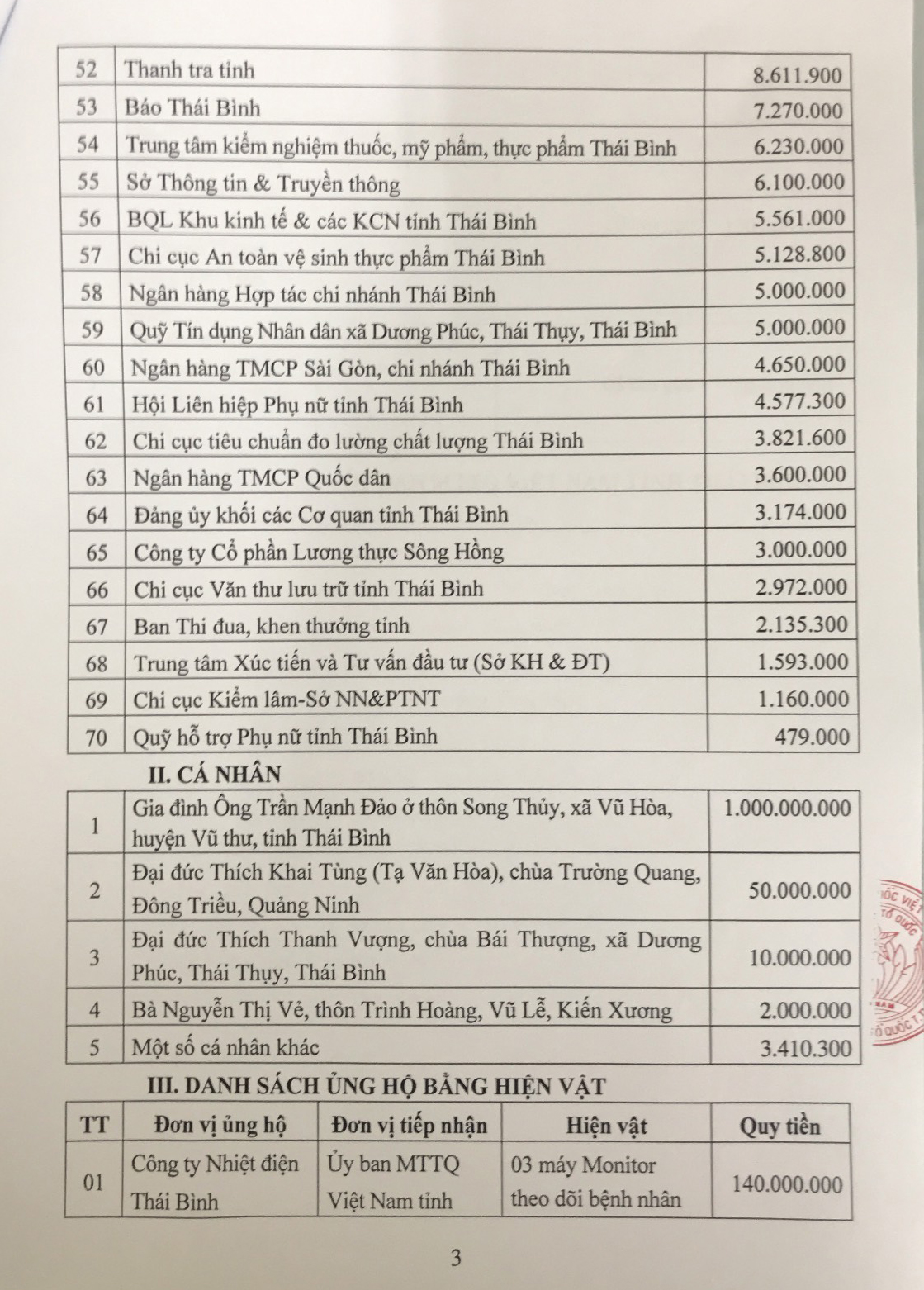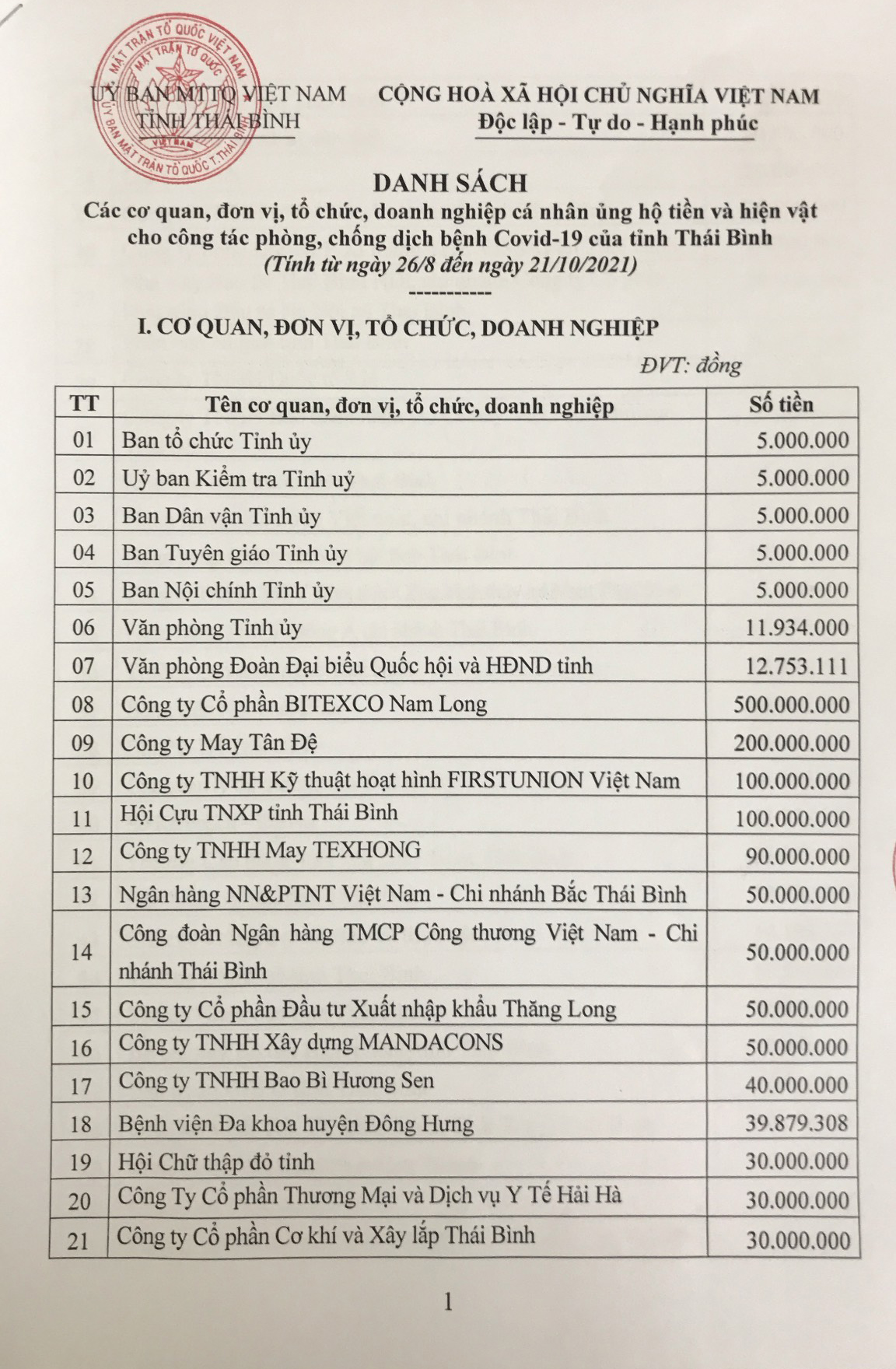 Danh sách các cơ quan, đơn vị, tổ chức, doanh nghiệp, cá nhân ủng hộ tiền và hiện vật cho công tác phòng, chống dịch Covid-19 của tỉnh Thái Bình (Tính từ ngày 26/8 đến ngày 21/10/2021)
