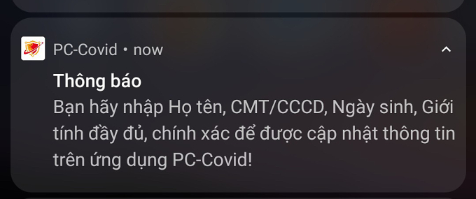 Ứng dụng PC-Covid gửi thông báo đến một số người đang điền sai hoặc thiếu thông tin.