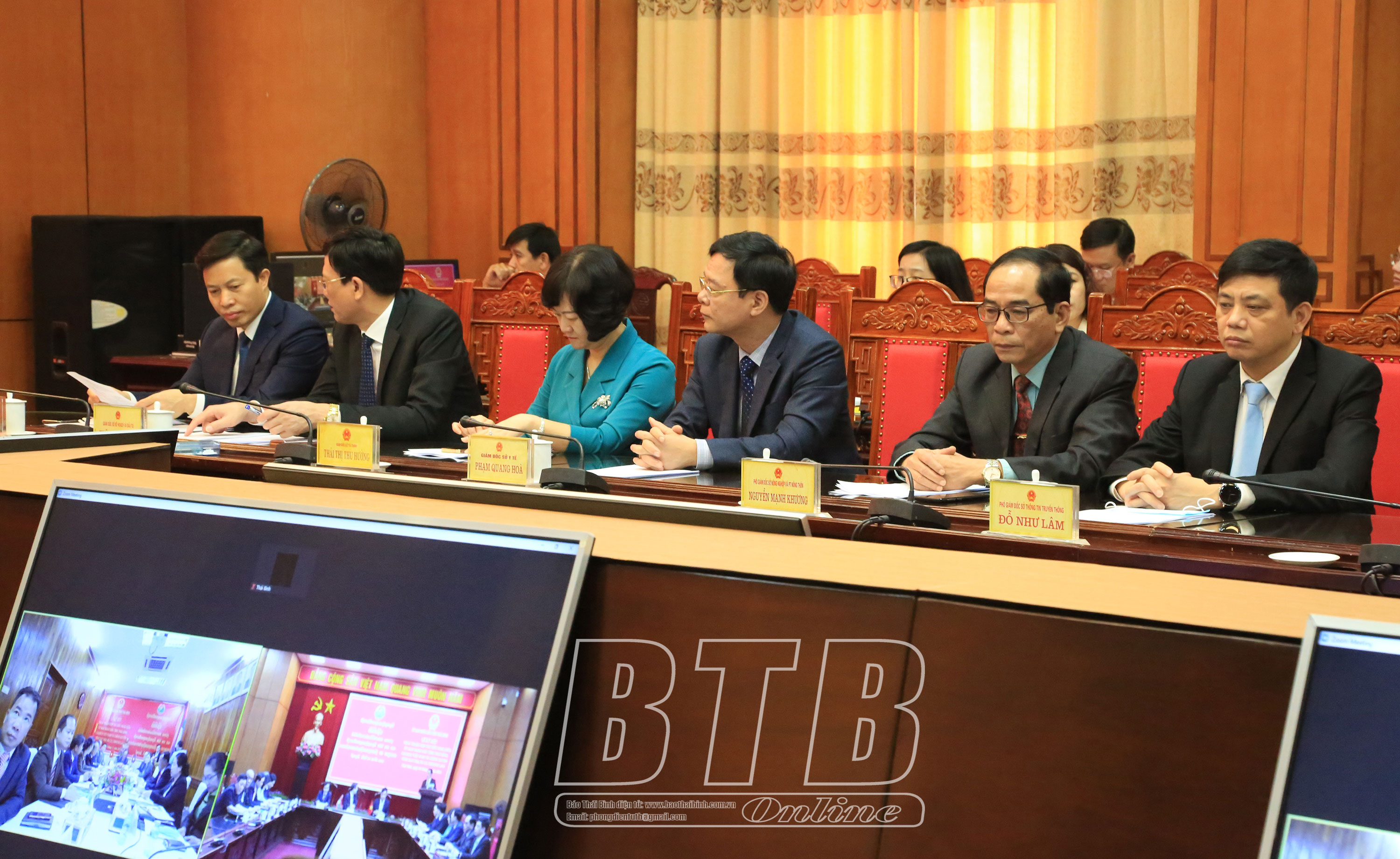 Các đồng chí lãnh đạo tỉnh và đại biểu chứng kiến lễ ký kết trực tuyến thỏa thuận hợp tác hữu nghị giữa UBND tỉnh Thái Bình và chính quyền tỉnh Xay Nhạ Bu Ly tại điểm cầu Thái Bình.