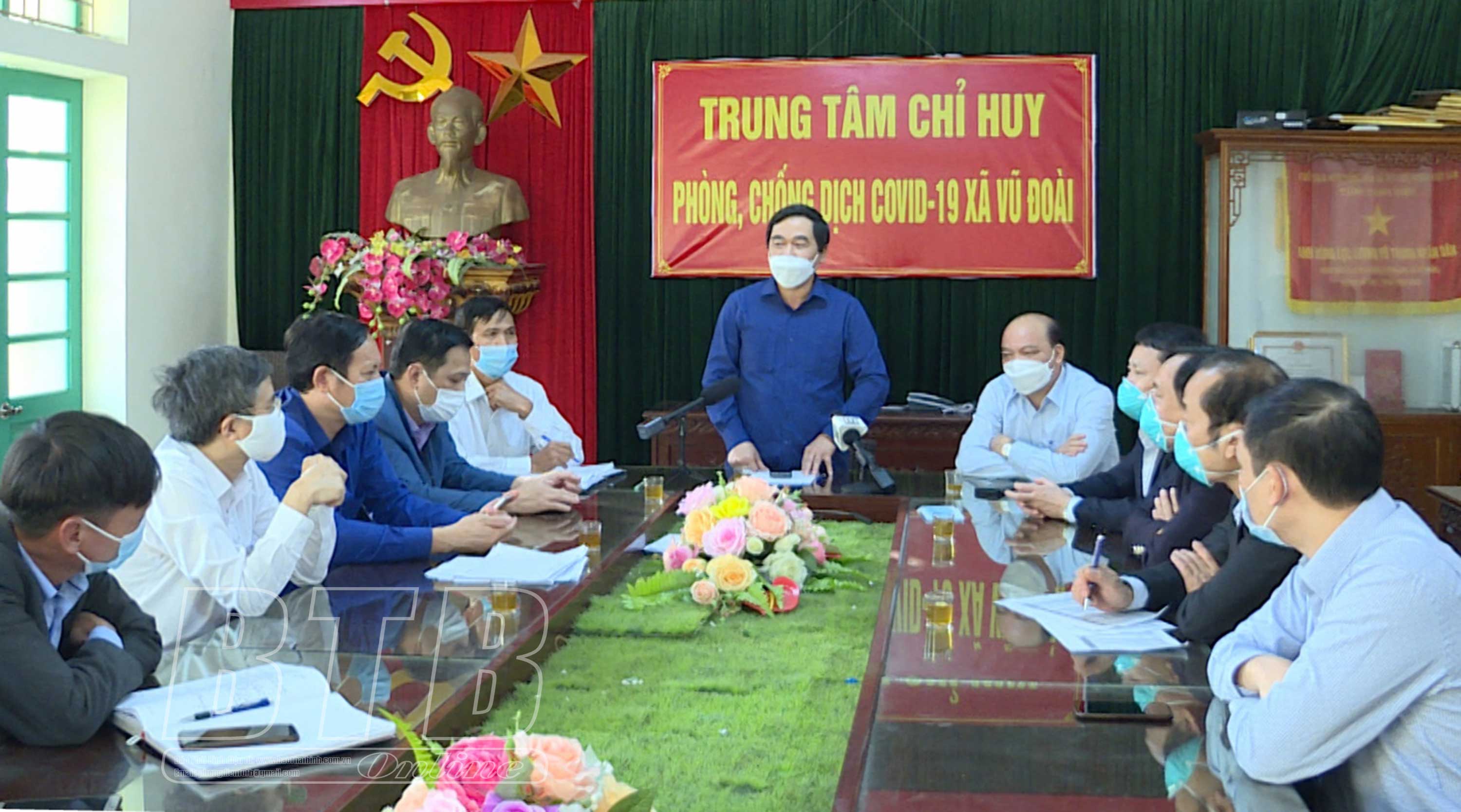 Làm việc với Ban Chỉ đạo phòng, chống dịch Covid-19 huyện Vũ Thư và xã Vũ Đoài, đồng chí Phó Bí thư thường trực Tỉnh ủy, Chủ tịch HĐND tỉnh đề nghị huyện Vũ Thư, xã Vũ Đoài khẩn trương thực hiện truy vết, rà soát để nắm rõ địa chỉ của từng công nhân đang làm việc tại doanh nghiệp có ca F0, thông báo đến các địa phương trong huyện, từ đó các xã chủ động thông báo đến từng gia đình xác định xã Vũ Đoài là địa phương có nguy cơ cao cho nên người dân trong xã “nội bất xuất, ngoại bất nhập”. Tiến hành phong tỏa doanh nghiệp phát hiện ca F0 để thực hiện phương châm “4 tại chỗ”, chuẩn bị mọi điều kiện ăn nghỉ cho công nhân ngay tại công ty để khoanh vùng kịp thời. Ngành Y tế khẩn trương xét nghiệm đối với các công nhân, người lao động làm việc trong công ty để phân loại các trường hợp có nguy cơ cao nhằm thực hiện các biện pháp cách ly y tế phù hợp. Quản lý chặt chẽ 28 công nhân từ tỉnh Nam Định và công nhân là người xã Vũ Đoài đang làm việc tại doanh nghiệp phục vụ công tác truy vết, xác định nguồn lây. Lực lượng công an phối hợp chặt chẽ với y tế và các lực lượng ở cơ sở khẩn trương truy vết các trường hợp liên quan, tổ chức xét nghiệm diện rộng và có biện pháp ngăn chặn kịp thời, không để dịch lây lan.