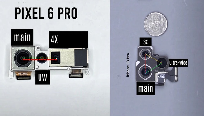Cụm camera Pixel 6 Pro (trái) xếp theo chiều ngang, trong khi iPhone 13 Pro (phải) là tam giác cân, giúp khoảng cách của các ống kính là bằng nhau. Ảnh: PhoneArena.