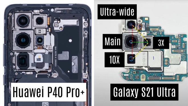 Vấn đề sẽ khó giải quyết hơn với những chiếc smartphone có 4 camera như Huawei P40 Pro+ hay Samsung Galaxy S21 Ultra. Tuy nhiên, các hãng này giải quyết bằng cách xếp 1 camera sang cạnh, từ đó tạo thành 2 cụm tam giác vuông. Như vậy, khoảng cách giữa các camera có tiêu cự gần nhau vẫn là tương đương.