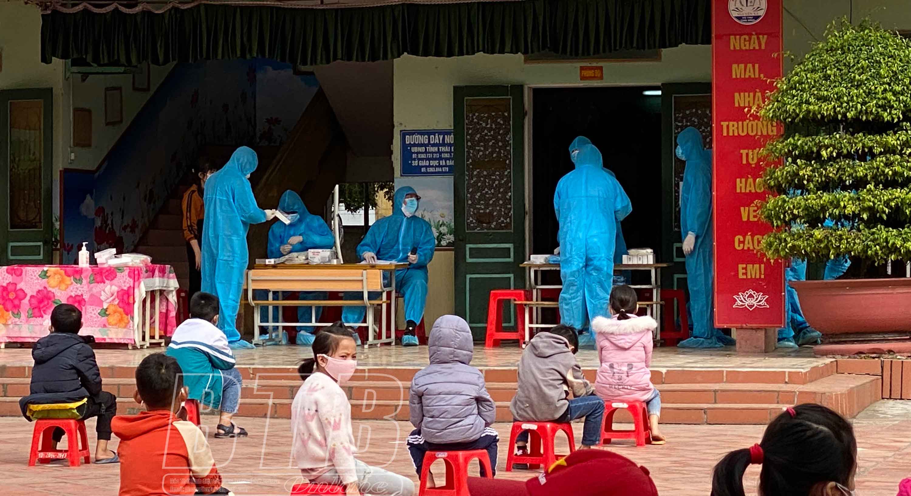 Lực lượng chức năng lấy mẫu xét nghiệm sàng lọc cho toàn bộ học sinh trên địa bàn xã Nguyên Xá (Vũ Thư).