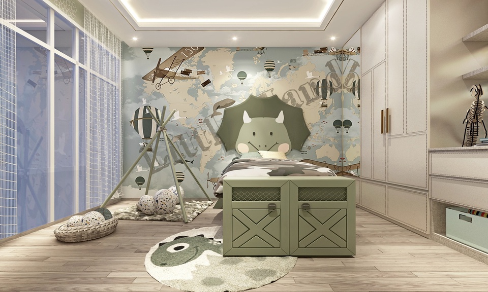 Phòng ngủ của trẻ được trang trí giấy dán tường bắt mắt, màu sắc trẻ trung.
