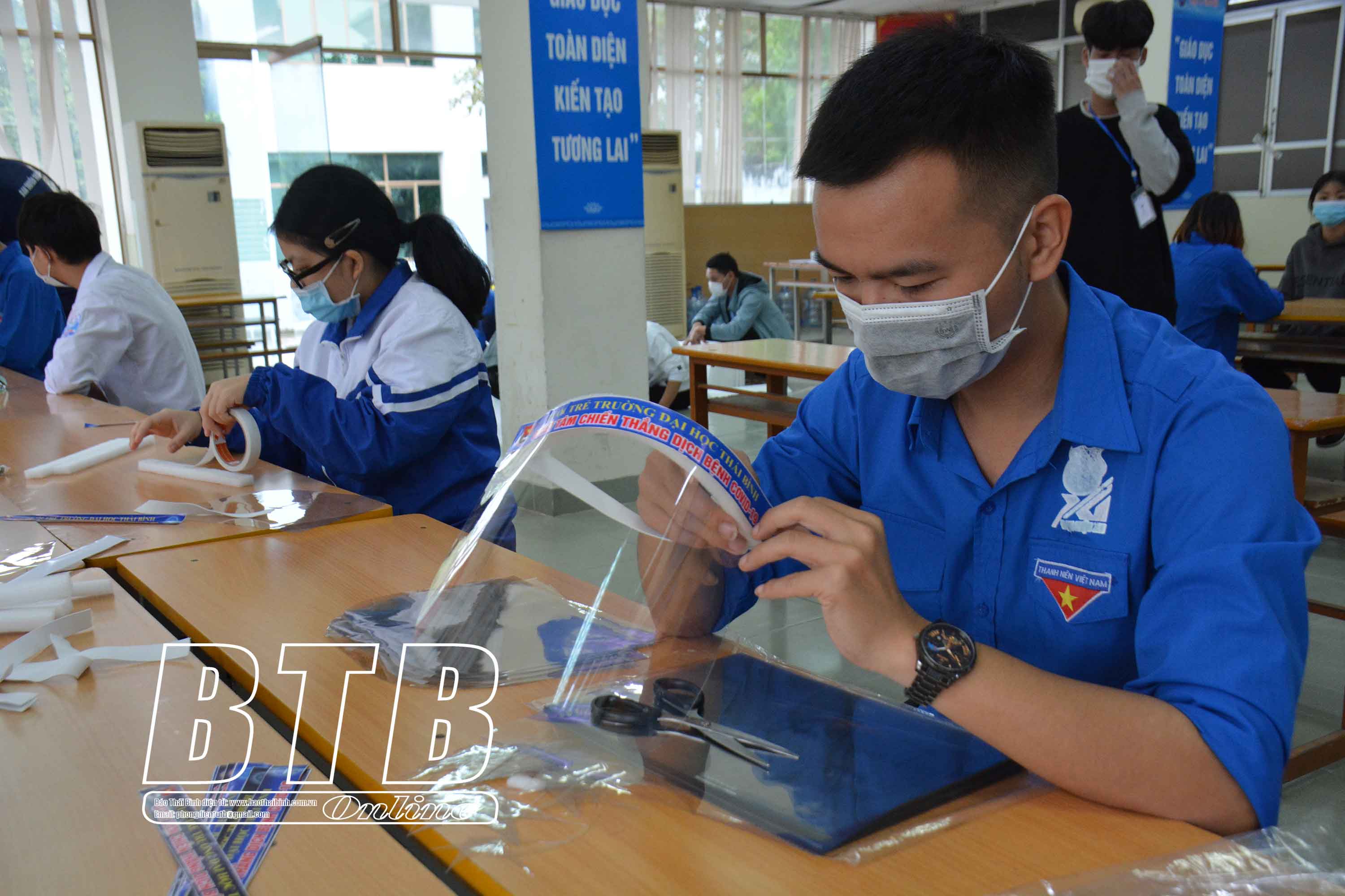 Lãnh đạo Tỉnh đoàn hướng dẫn sinh viên Trường Đại học Thái Bình làm kính chắn giọt bắn.