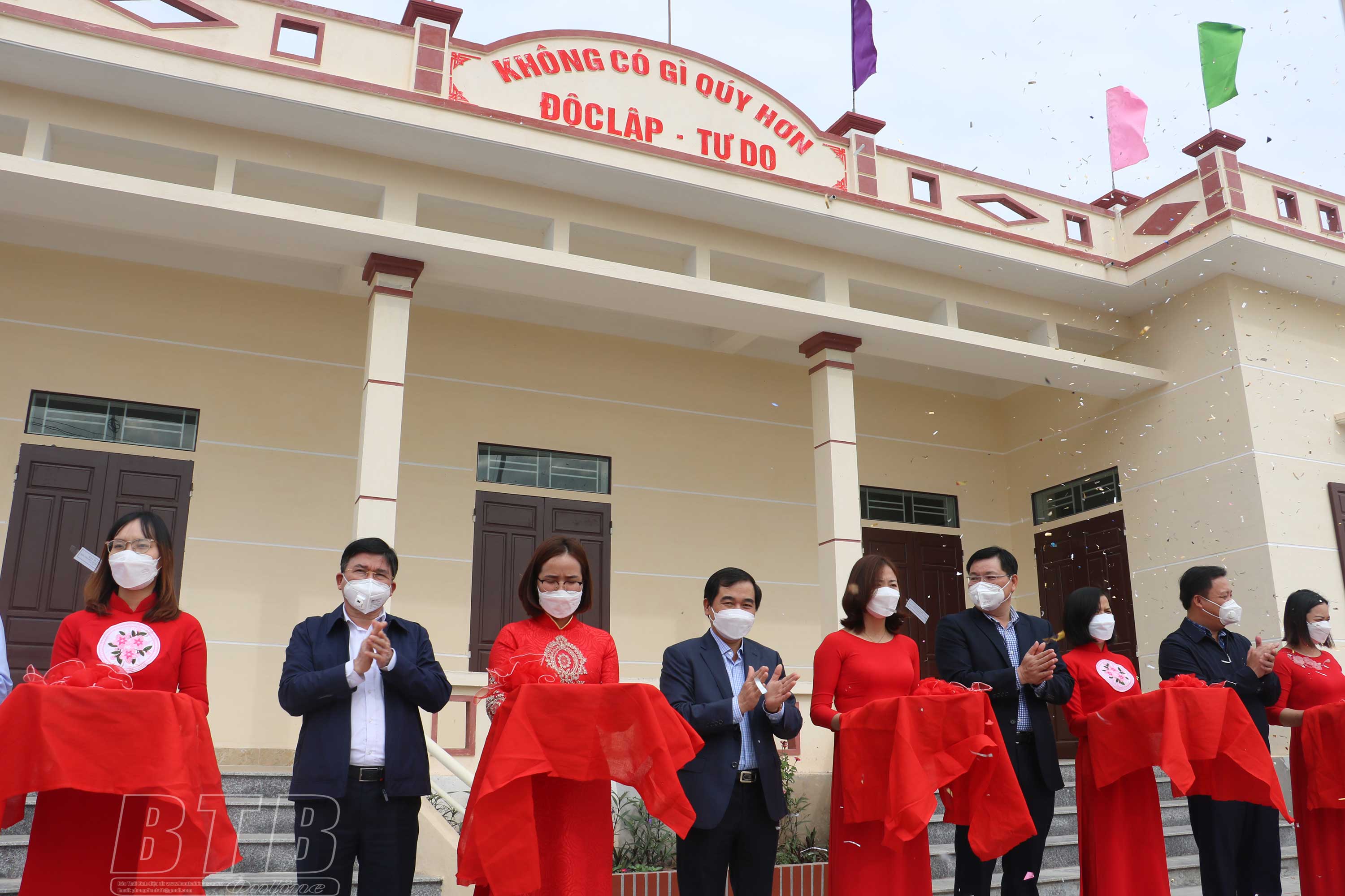 Các đồng chí lãnh đạo tỉnh, huyện cắt băng khánh thành nhà văn hóa thôn Nội Lang Nam.