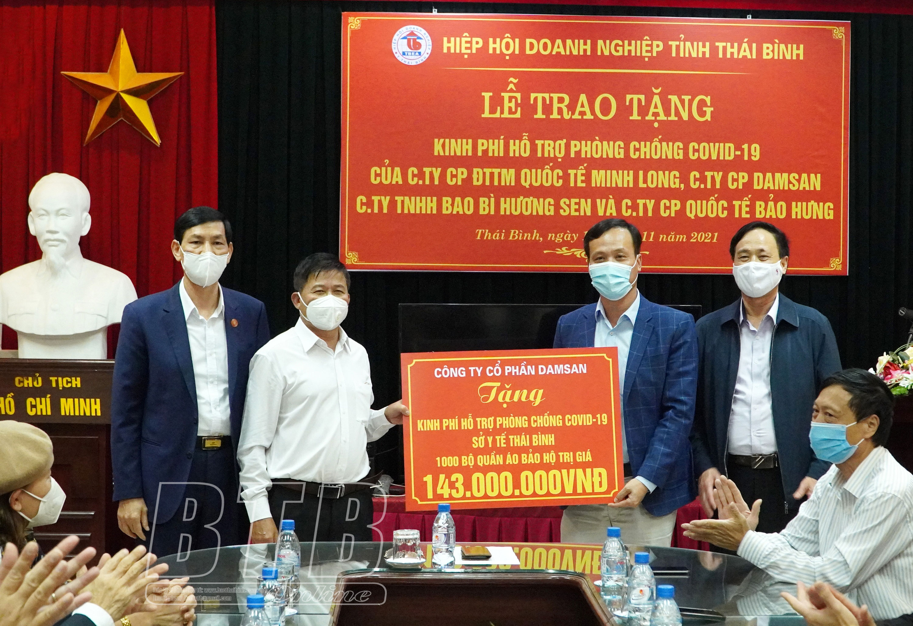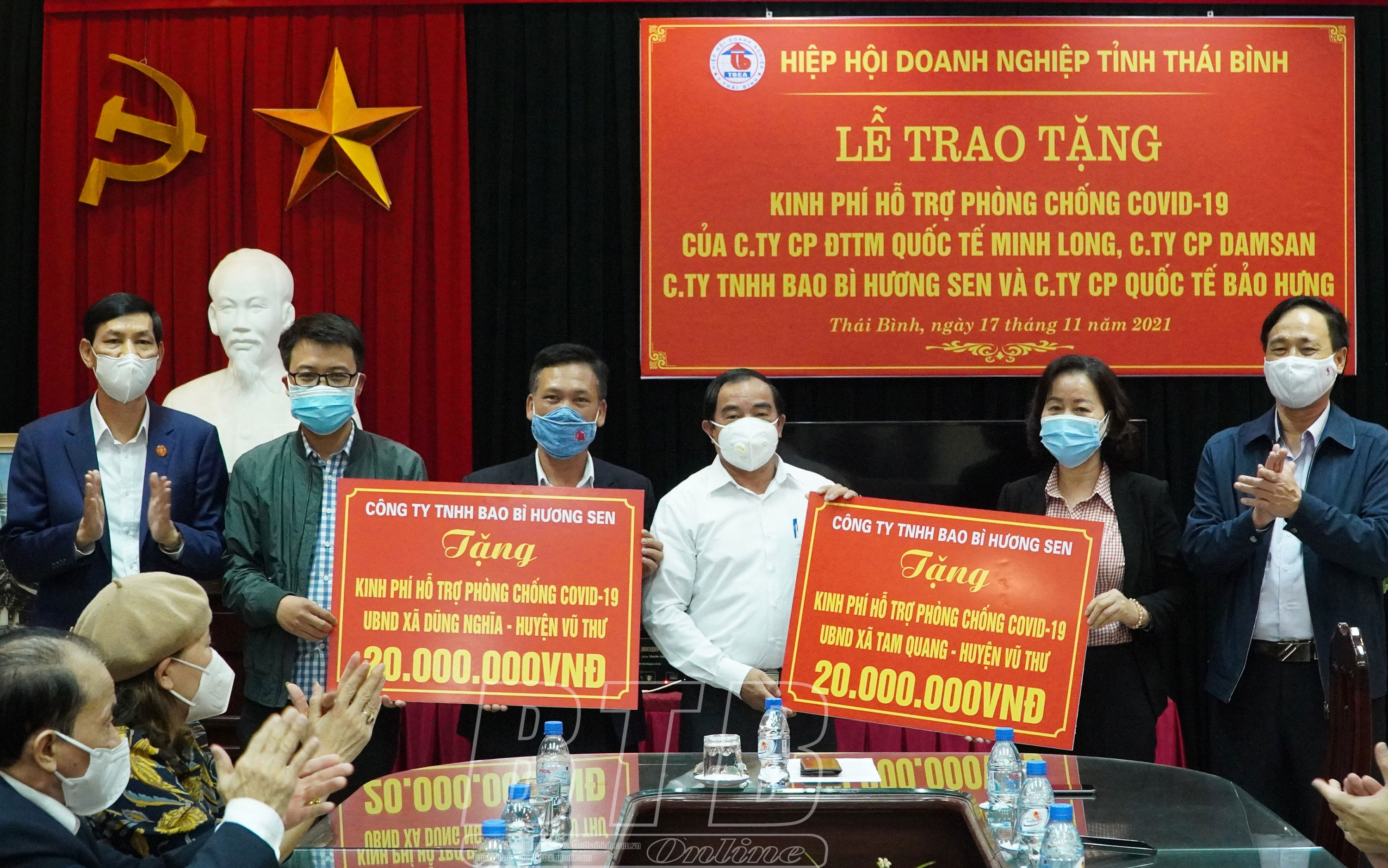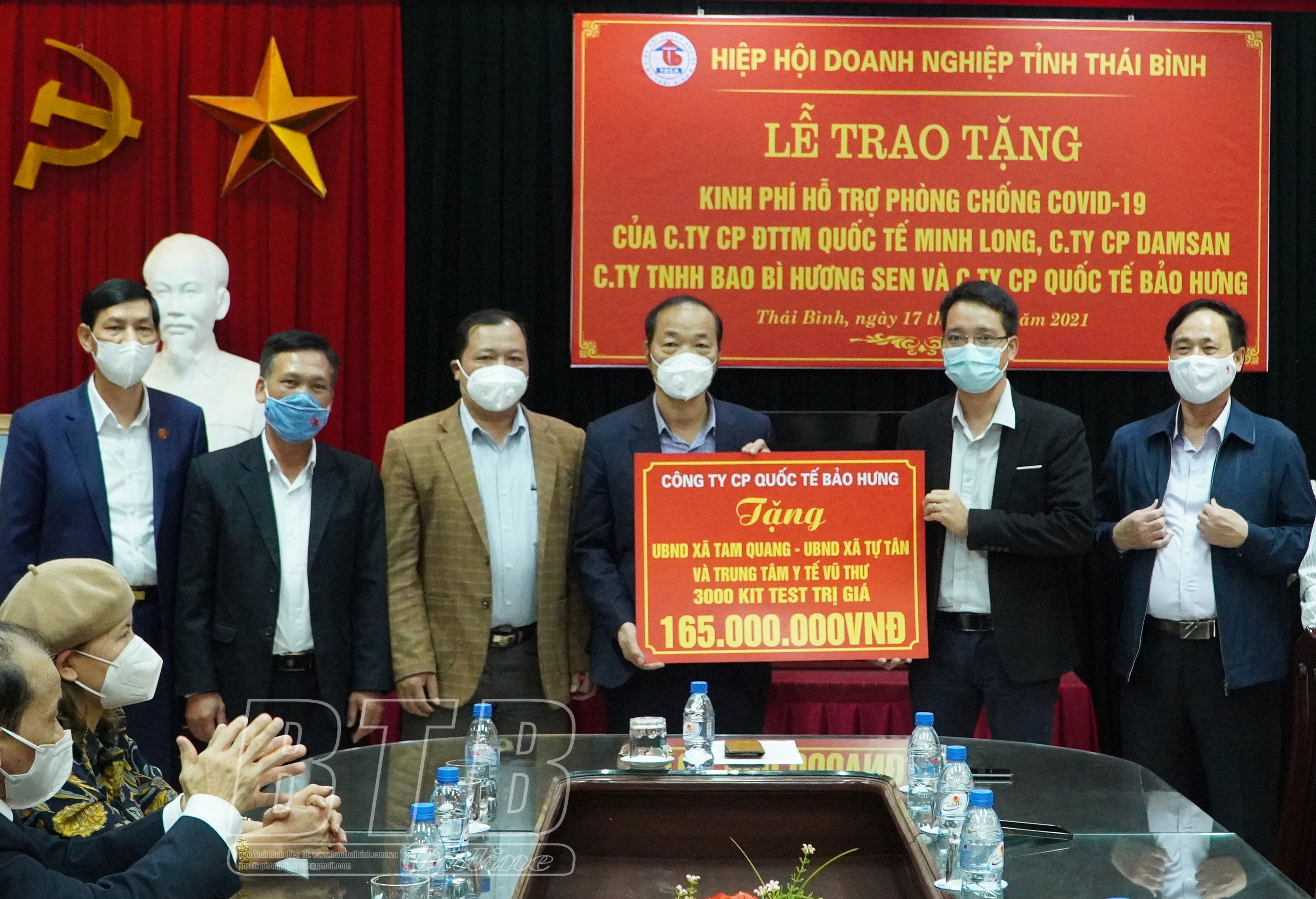 Tại buổi lễ, đại diện Công ty Cổ phần Đầu tư thương mại Quốc tế Minh Long trao cho Hiệp hội Doanh nghiệp tỉnh, Bệnh viên Đa khoa tỉnh, Ban Bảo vệ chăm sóc sức khỏe tỉnh, UBND phường Hoàng Diệu, UBND thành phố Thái Bình tổng kinh phí 500 triệu đồng; Công ty Cổ phần Damsan trao số tiền 143 triệu đồng, tương đương 10.000 bộ quần áo bảo hộ y tế cho Sở Y tế phục vụ Bệnh viện dã chiến của tỉnh; Công ty Cổ phần Quốc tế Bảo Hưng trao 3.000 kit test Covid-19 trị giá 165 triệu đồng cho Trung tâm Y tế huyện Vũ Thư, UBND các xã Tự Tân, Tam Quang (huyện Vũ Thư); Công ty TNHH Bao bì Hương Sen trao cho UBND xã Tam Quang và UBND xã Dũng Nghĩa (huyện Vũ Thư) gói hỗ trợ mua kit test Covid-19 trị giá 20 triệu đồng/xã.