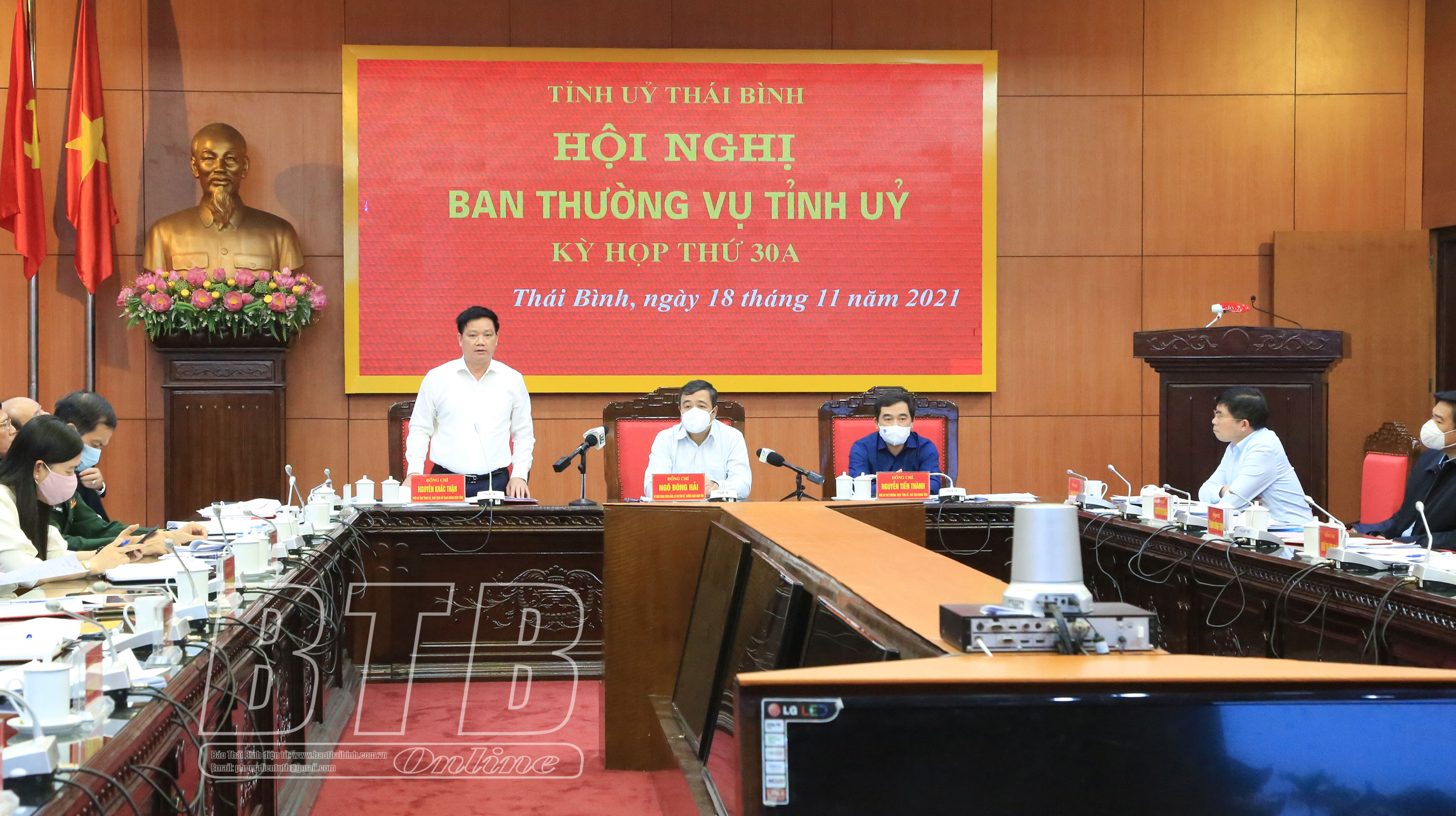 Chiều ngày 18/11, Ban Thường vụ Tỉnh ủy tổ chức hội nghị nghe Ban Cán sự đảng UBND tỉnh báo cáo về Kế hoạch phát triển Khu kinh tế Thái Bình giai đoạn 2021 - 2025, định hướng đến năm 2030. Các đồng chí: Ngô Đông Hải, Ủy viên Ban Chấp hành Trung ương Đảng, Bí thư Tỉnh ủy; Nguyễn Tiến Thành, Phó Bí thư thường trực Tỉnh ủy, Chủ tịch HĐND tỉnh; Nguyễn Khắc Thận, Phó Bí thư Tỉnh ủy, Chủ tịch UBND tỉnh chủ trì hội nghị. Dự hội nghị có các đồng chí Ủy viên Ban Thường vụ Tỉnh ủy; lãnh đạo HĐND, UBND tỉnh; lãnh đạo Đoàn đại biểu Quốc hội tỉnh; lãnh đạo một số sở, ban, ngành.